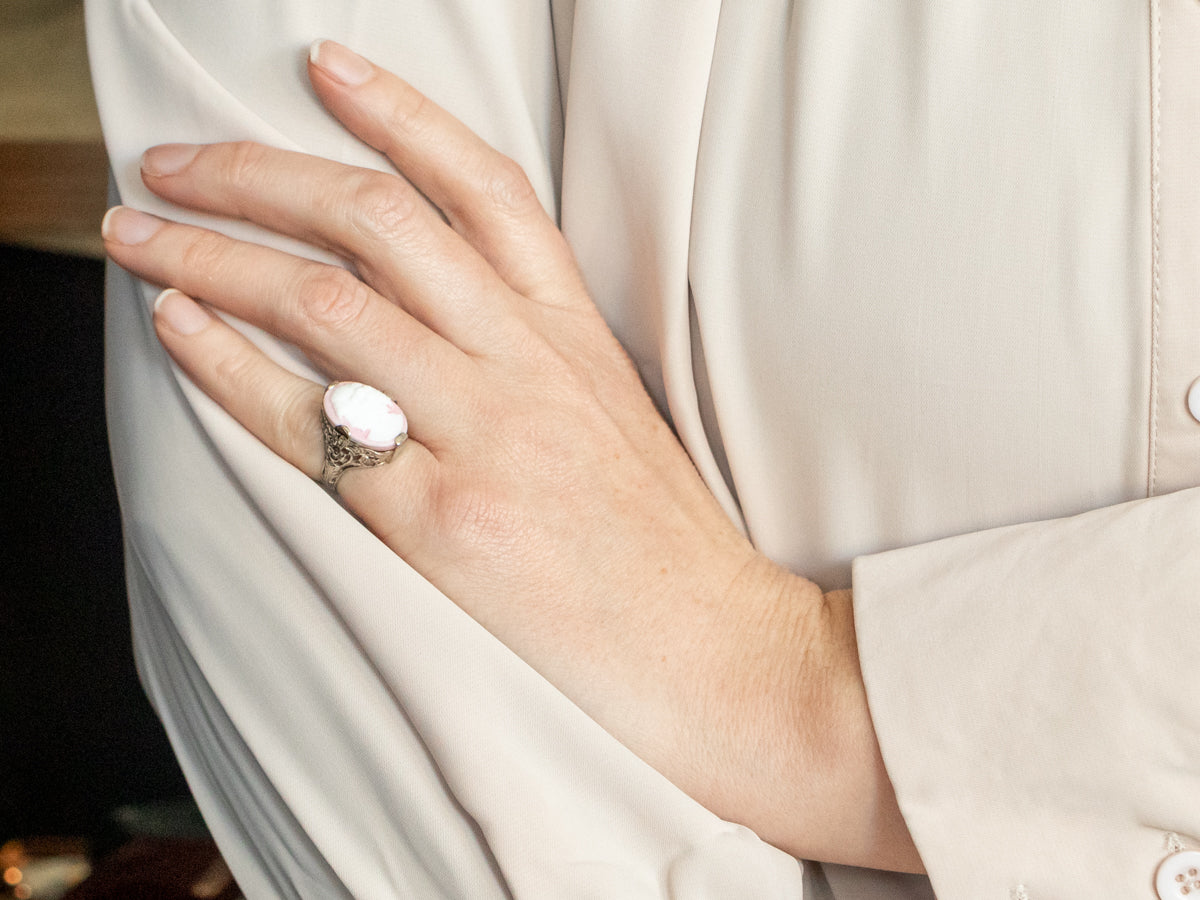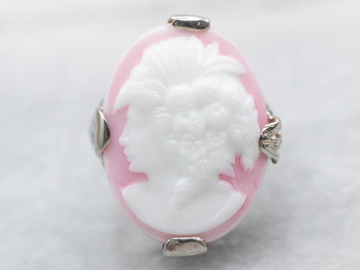 Sweet and full of detail, this Art Deco cameo ring is something special! The filigree is impressive, created using the die-stamping method that produces very fine detail while remaining strong and resilient. The pink glass cameo depicts a woman with 1920s styling, flowers set in curls, and an open neckline.