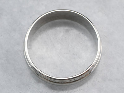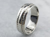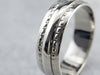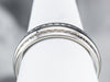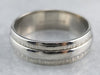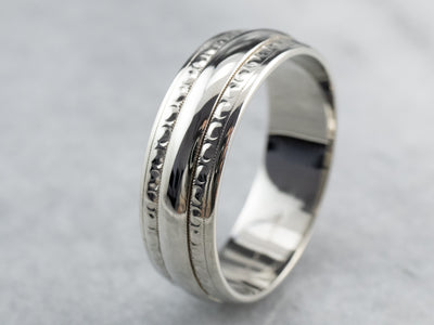 This is a vintage Columbia band is from the Mid- Century era. The center is a simple, geometric pattern of dots and lines, crafted from highly polished 14 karat white gold. This is a funky, fun band that's great for every day or for a wedding piece!