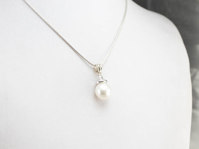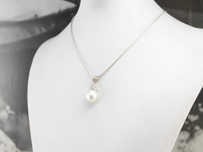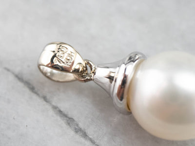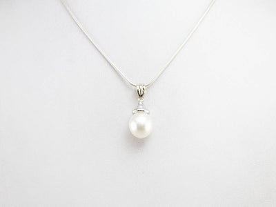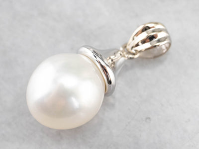 Sophisticated and classic! This single cultured pearl is oval, nearly teardrop in shape. Set in a cap of gold, the shine of the highly polished metal and the soft luster of the pearl complement each other to perfection. This would be a lovely bridal piece, a sweet gift that could be worn layered with other necklaces for a more casual look.