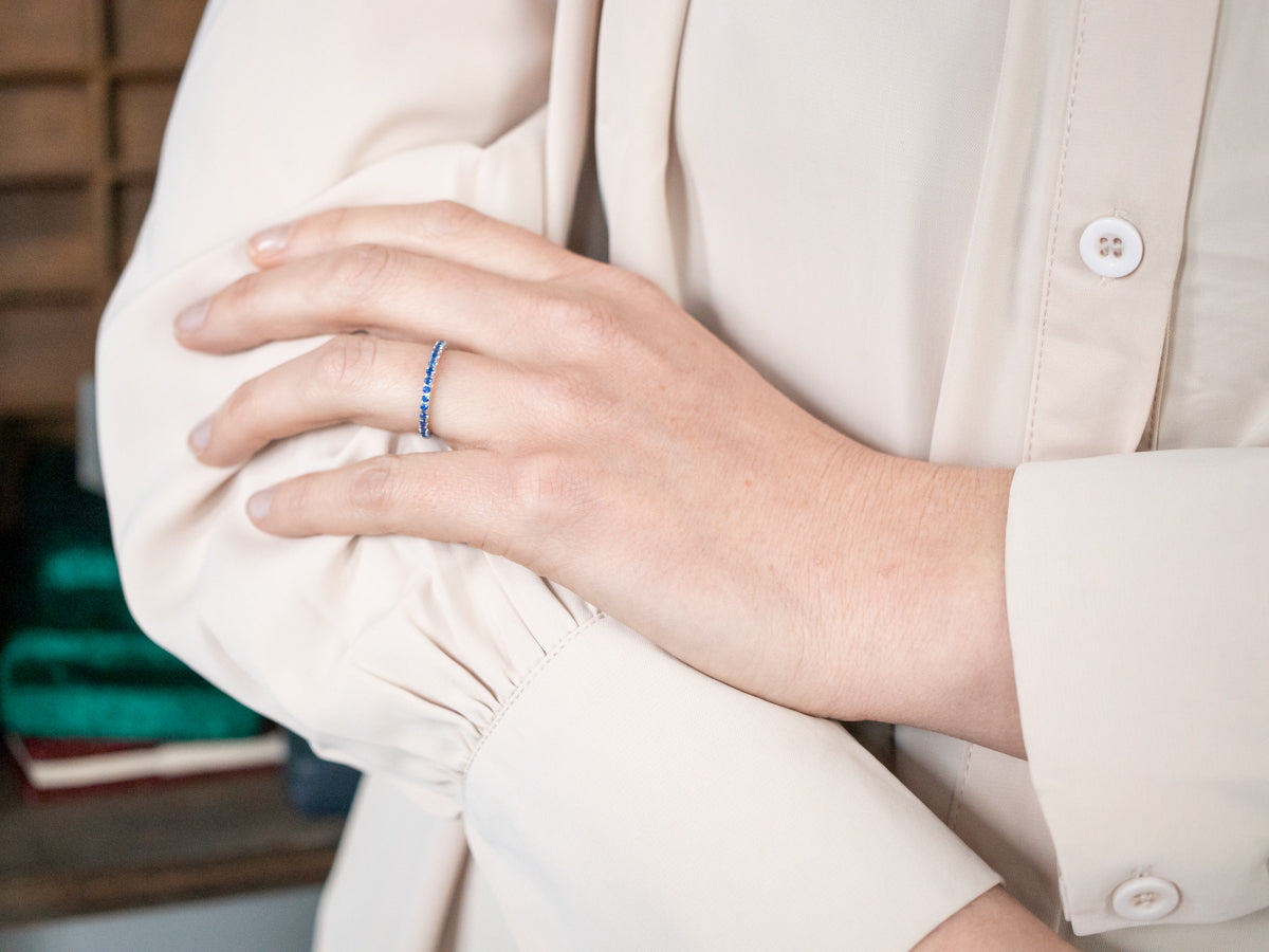 This eternity band is crafted of white gold. Deep blue sapphires adorn the entirety of the band. Ready to pair with an engagement ring, stack with other bands, or simply wear on its own!
