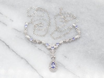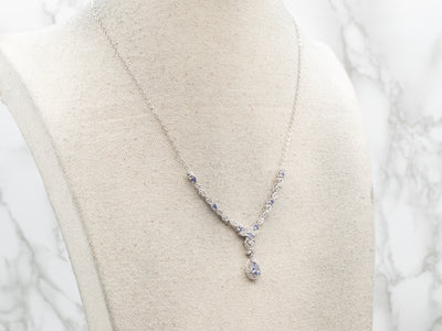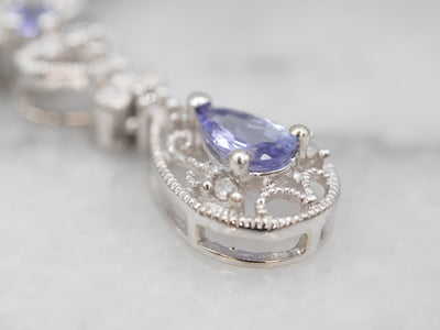Metal: 14K White Gold Gem: 8 Tanzanite totaling .80 Carats Gem Measurements: 3.8 x 5.4 mm, Pear Cut Accents: 17 Diamonds totaling .18 Carats, SI-I in Clarity, H-I in Color Length: 17 Inches Marks: "14K ESI XL" Stamped on the clasp