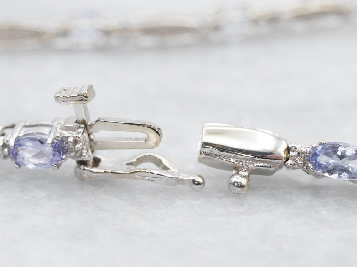 This exquisite tennis bracelet is crafted from white gold and set with diamonds and tanzanite gemstones. The bracelet design will add a sophisticated sparkle to any formal look. The design of the bracelet ensures that the diamonds and gemstones will shine from every angle.