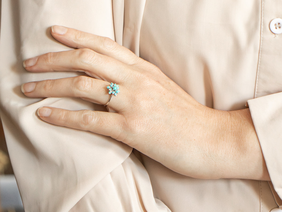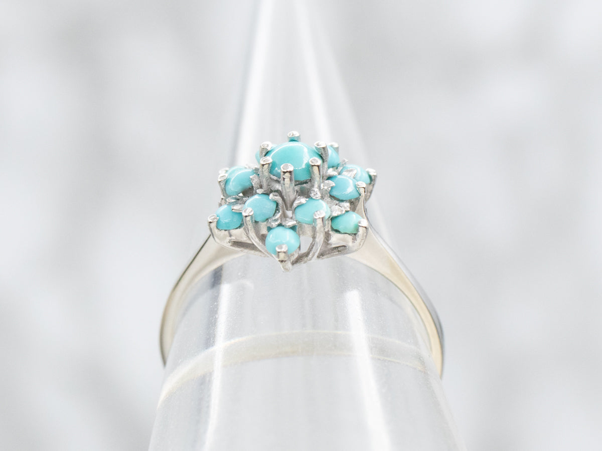 Looking for a unique addition to your jewelry collection? Check out this ring! Crafted with stunning white gold and a gorgeous turquoise cluster, this ring is sure to add a pop of color and style to any outfit. Perfect for the playful and quirky fashionista!