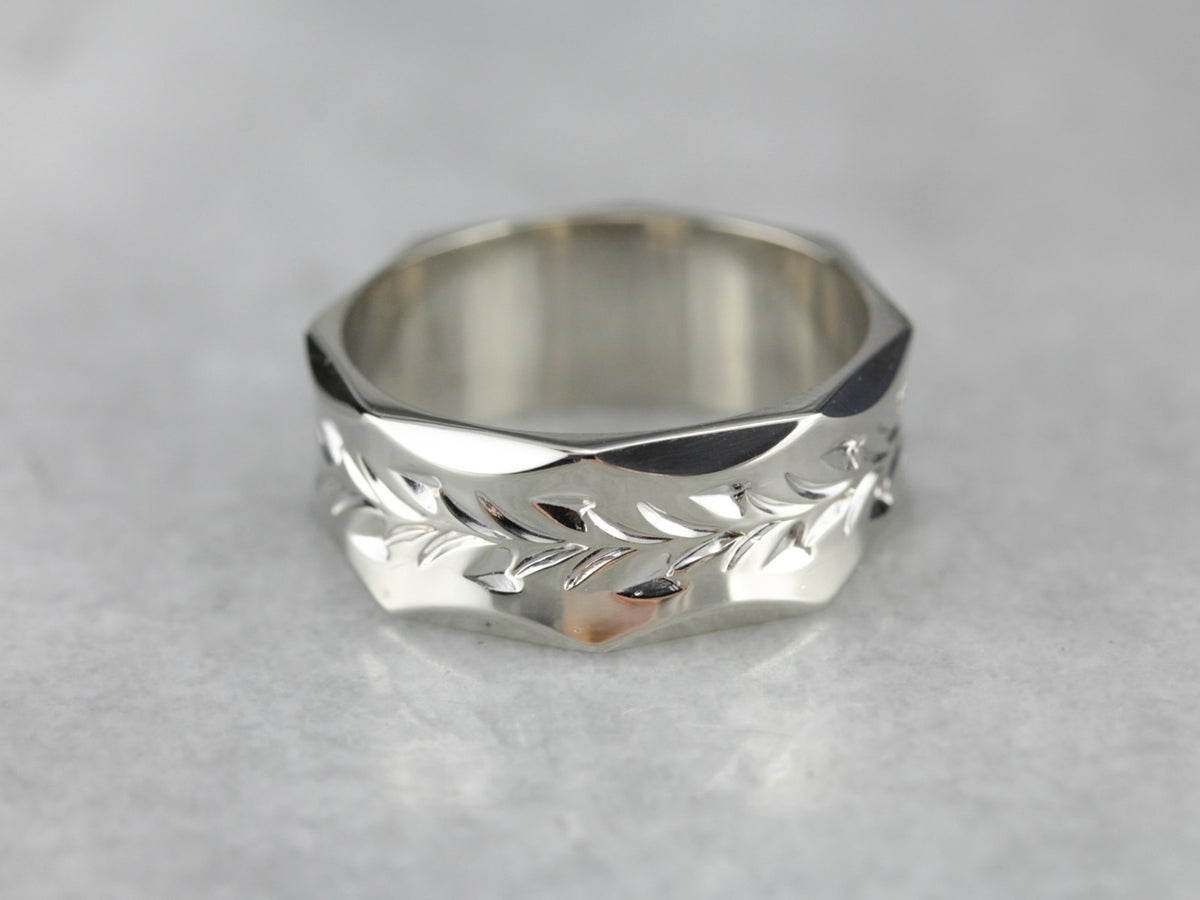 This flowing etch pattern band has amazing style! A stylized wheat pattern wraps around the entirety of the band, the combination of the bright white metal and the sweet motif is absolutely exquisite, and the ring has a super comfortable feel on the finger!