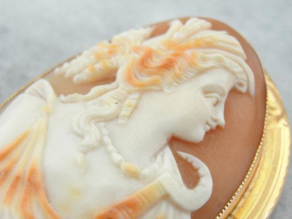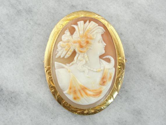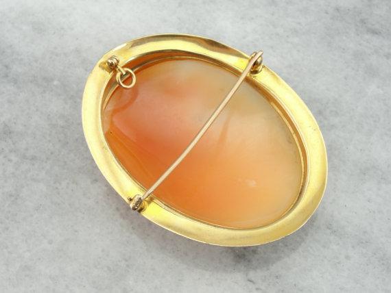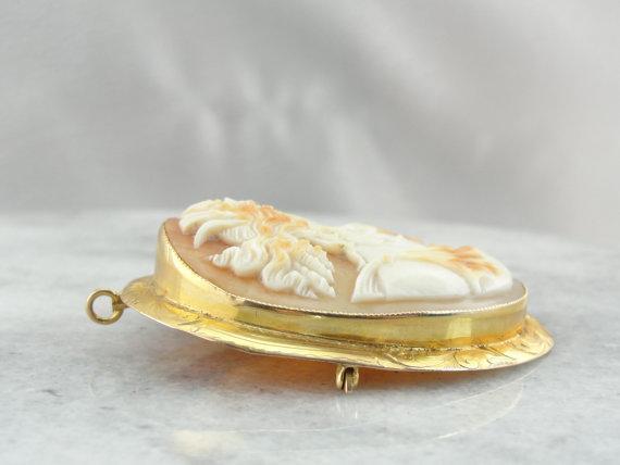 This antique brooch or pendant is crafted in wonderful tones of cream, yellow and orange. 10K yellow gold comprises the frame, while the cameo at the center is carved from pale conch shell. This antique can be worn as either a pin or a pendant.