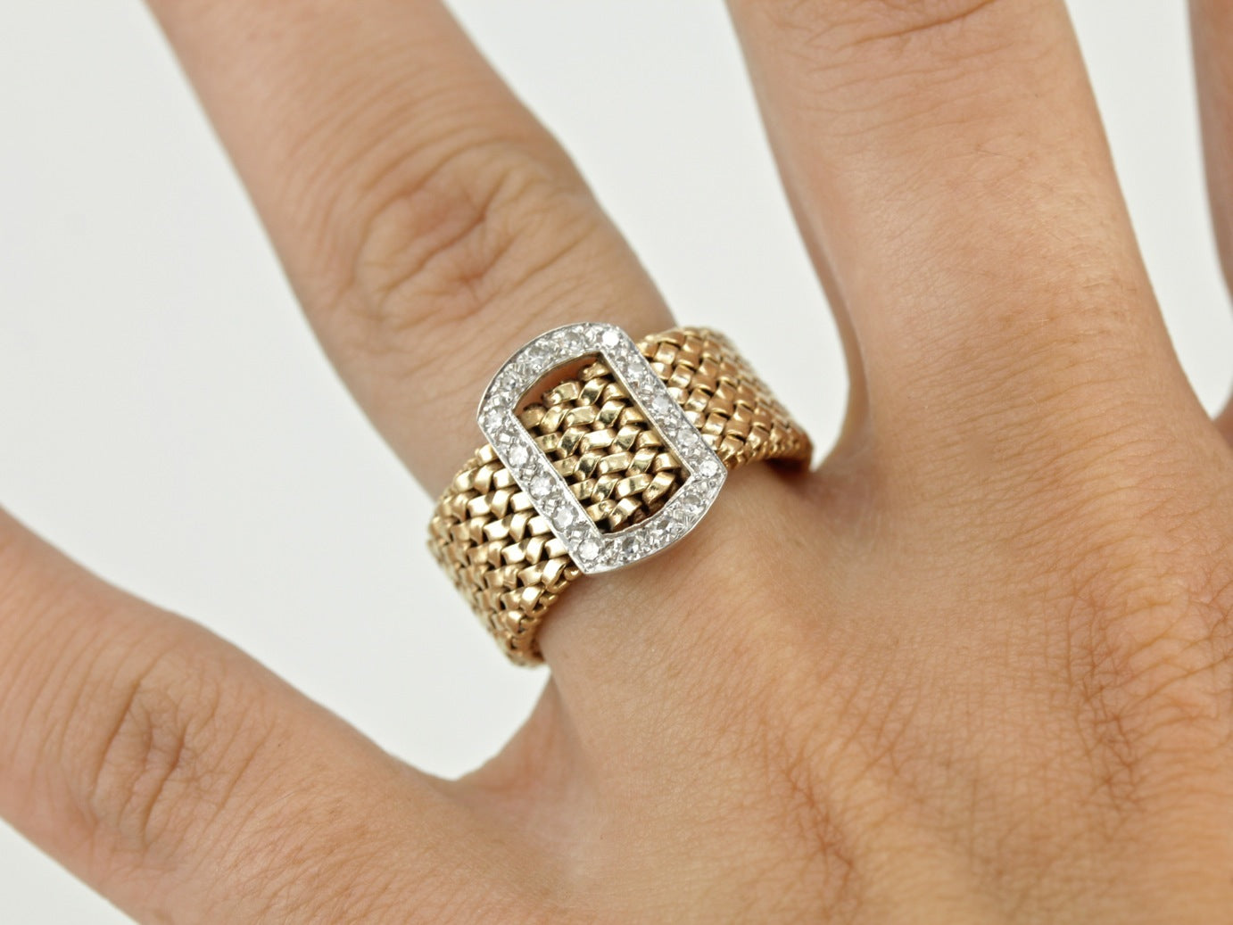 What a stunning piece! Buckle rings never go out of style, and have been a popular motif for jewelry for hundreds of years. This particular buckle is pave set with sixteen bright sparkly diamonds and is crafted of 14 karat white and yellow gold! Super comfortable to wear, this wide vintage band is crafted with a flexible mesh chain design!