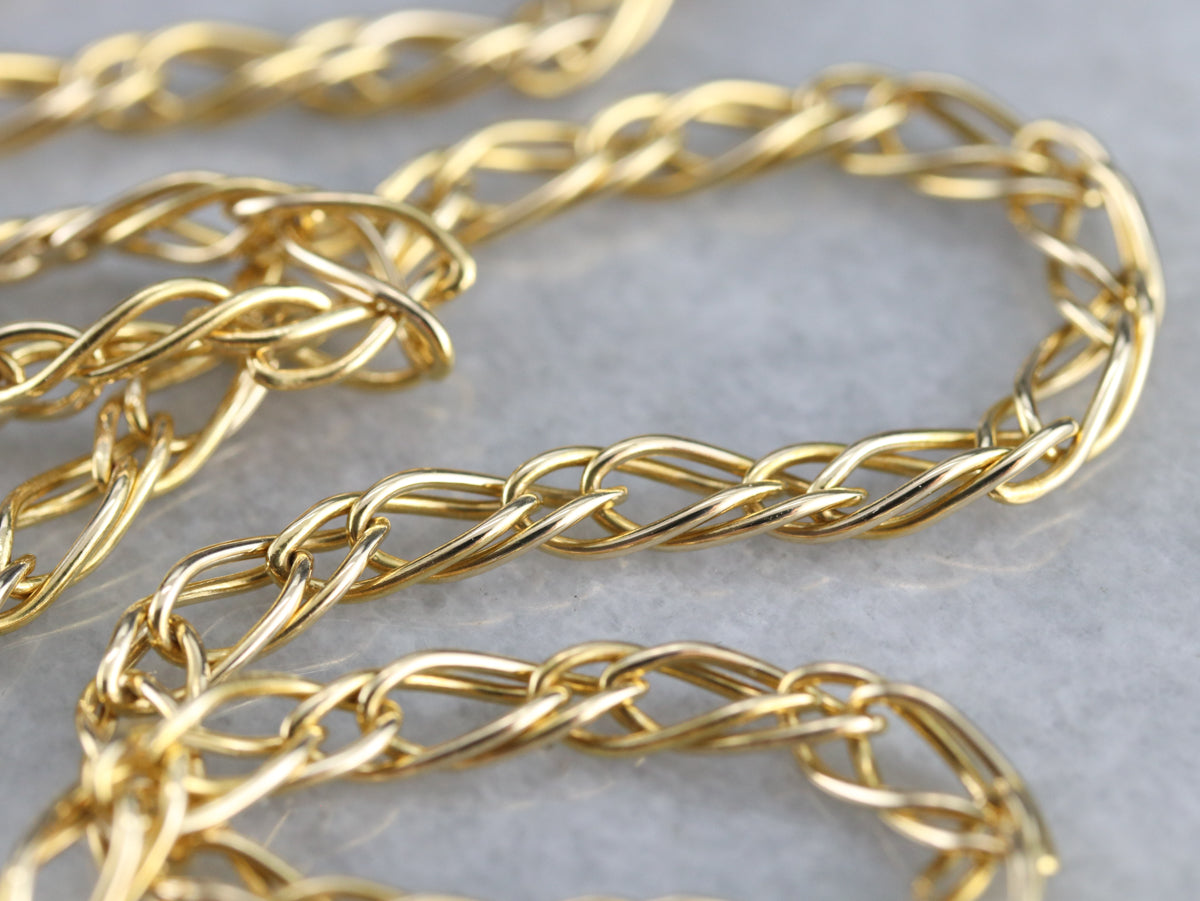 This fancy oval link gold chain necklace is beautiful! Fine woven elongated links are perfectly polished, creating a lovely play of light. This is a very fine piece that would make a wonderful gift.