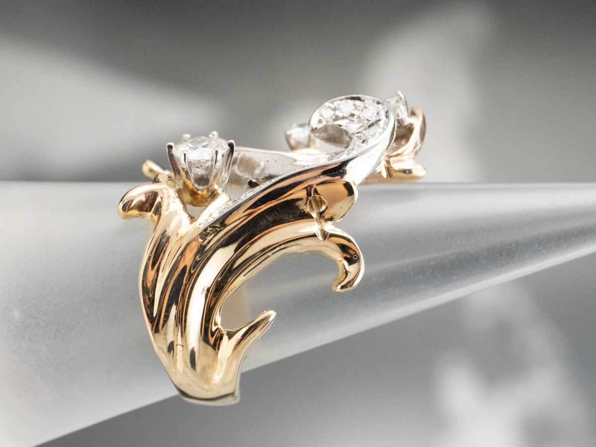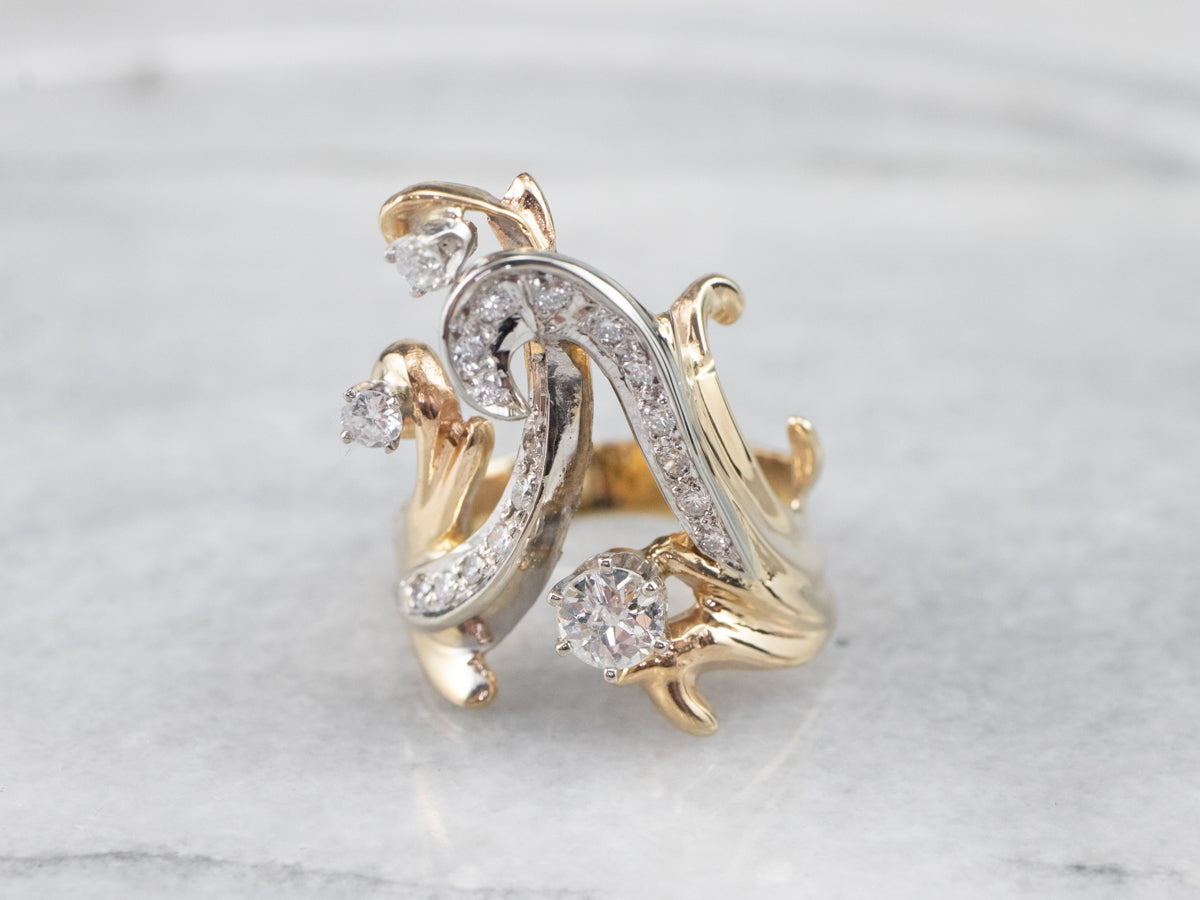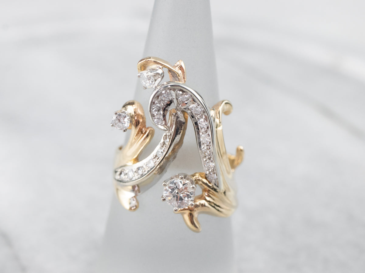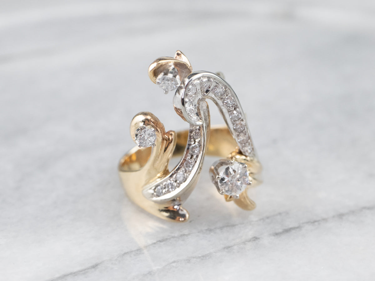 Sweetly scrolling, a sparkling diamond adorns the center of this fantastic ring! The center is accented by polished white gold, and by a swirling diamond design, which gives the ring almost a sense of movement! With lovely little details in between the designs and plenty of sparkles, this definitely makes for one unique and beautiful ring!