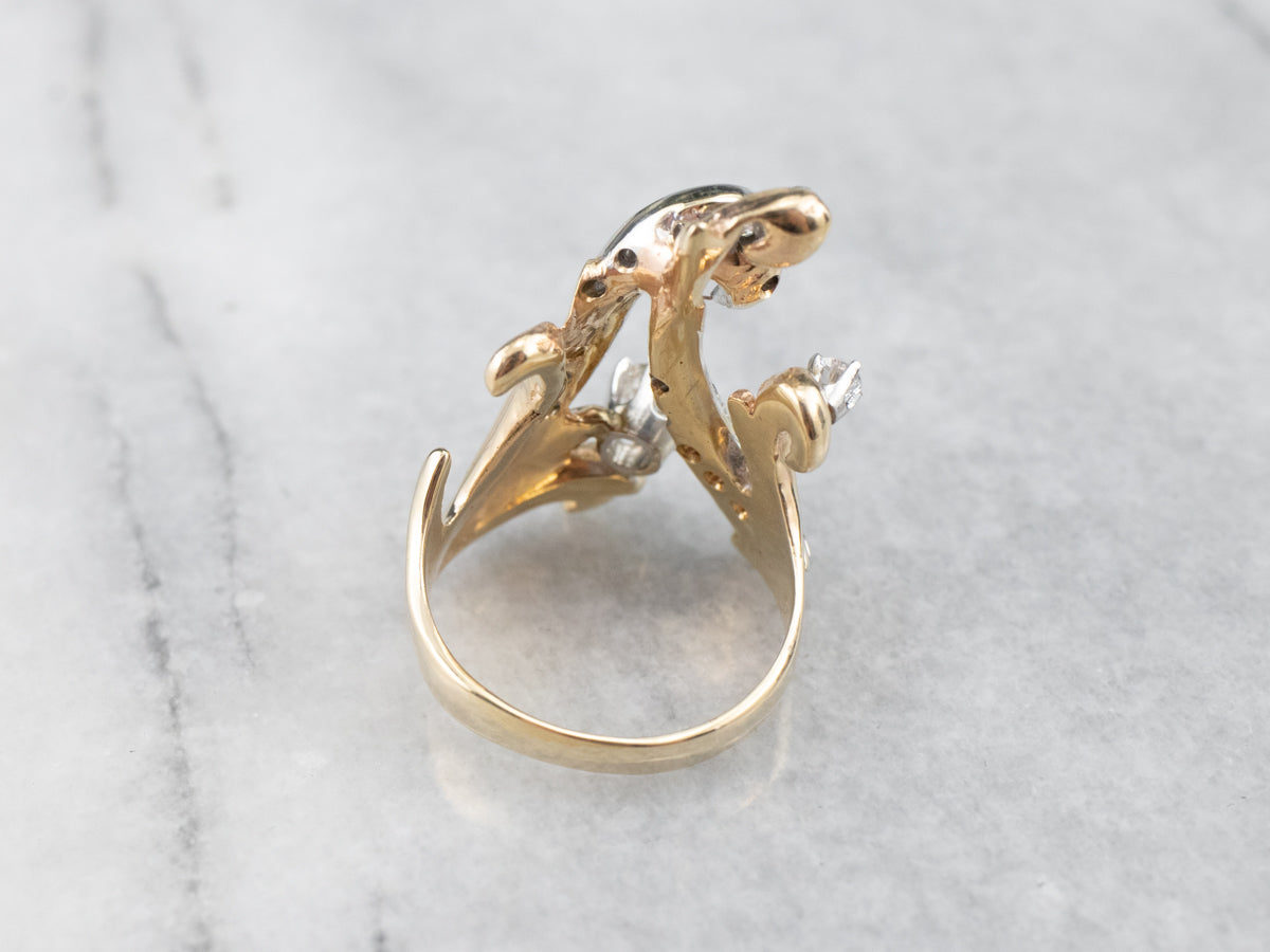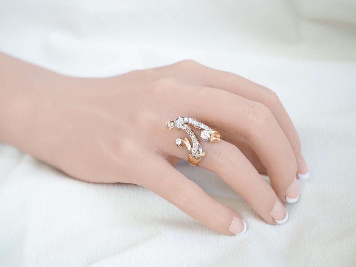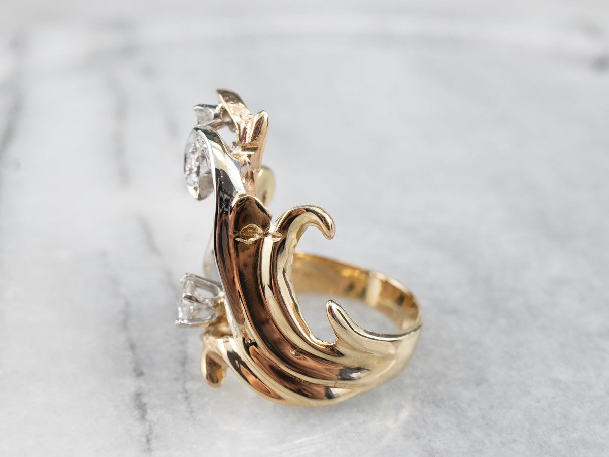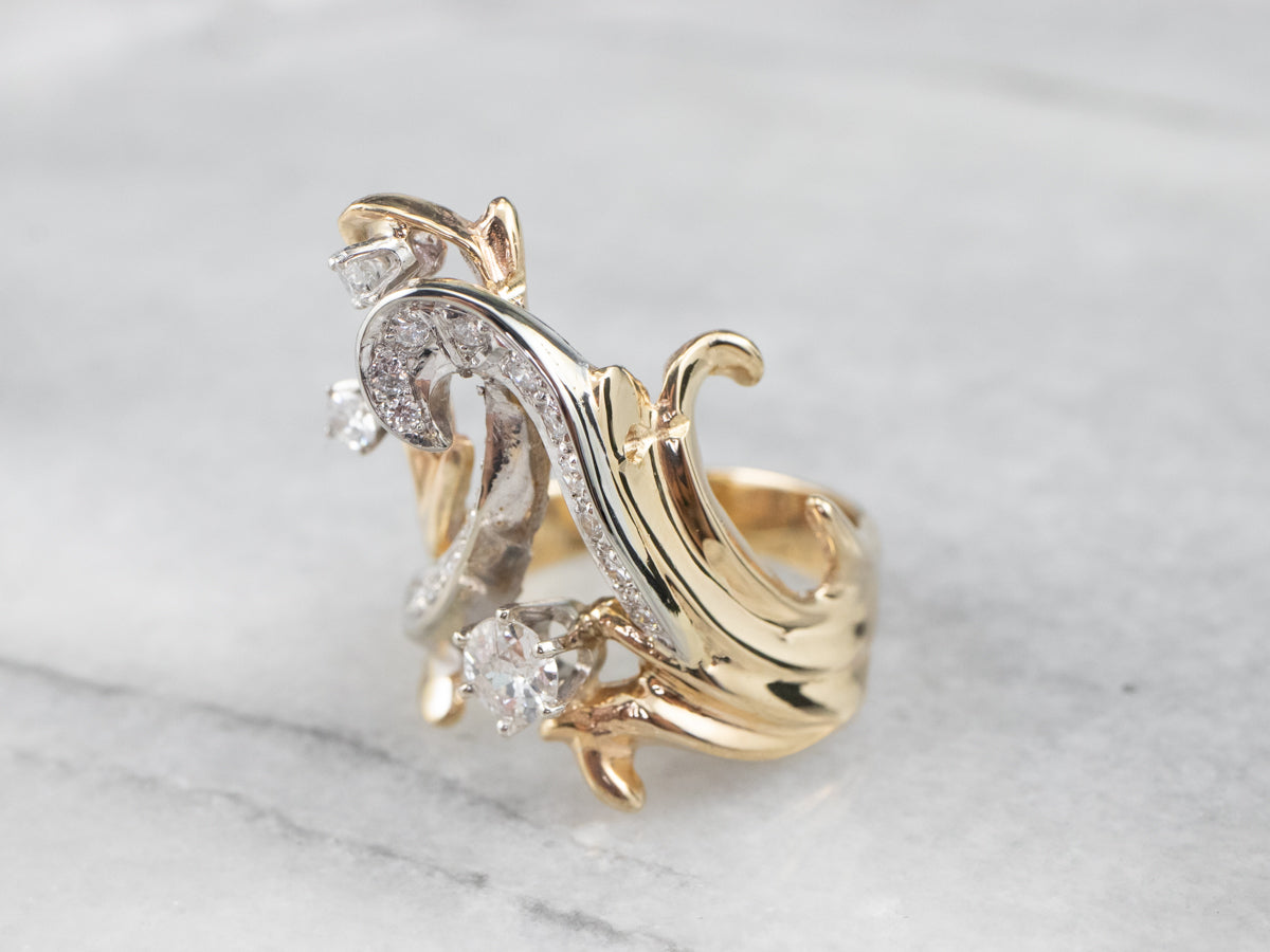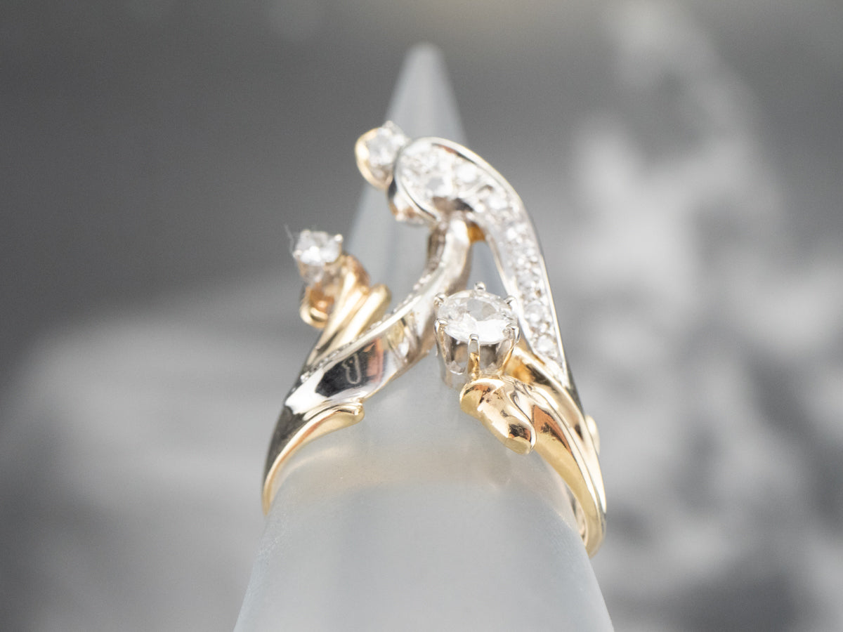 Sweetly scrolling, a sparkling diamond adorns the center of this fantastic ring! The center is accented by polished white gold, and by a swirling diamond design, which gives the ring almost a sense of movement! With lovely little details in between the designs and plenty of sparkles, this definitely makes for one unique and beautiful ring!