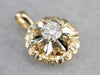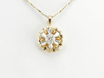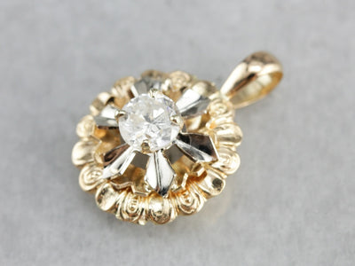 Natural looking and open, this pretty, simple pendant would be a lovely day to day piece! The yellow gold petal engraved motifs and decorations are brushed finish, giving them a soft, feminine appearance. At the center is a brilliant diamond weighing over half a carat.