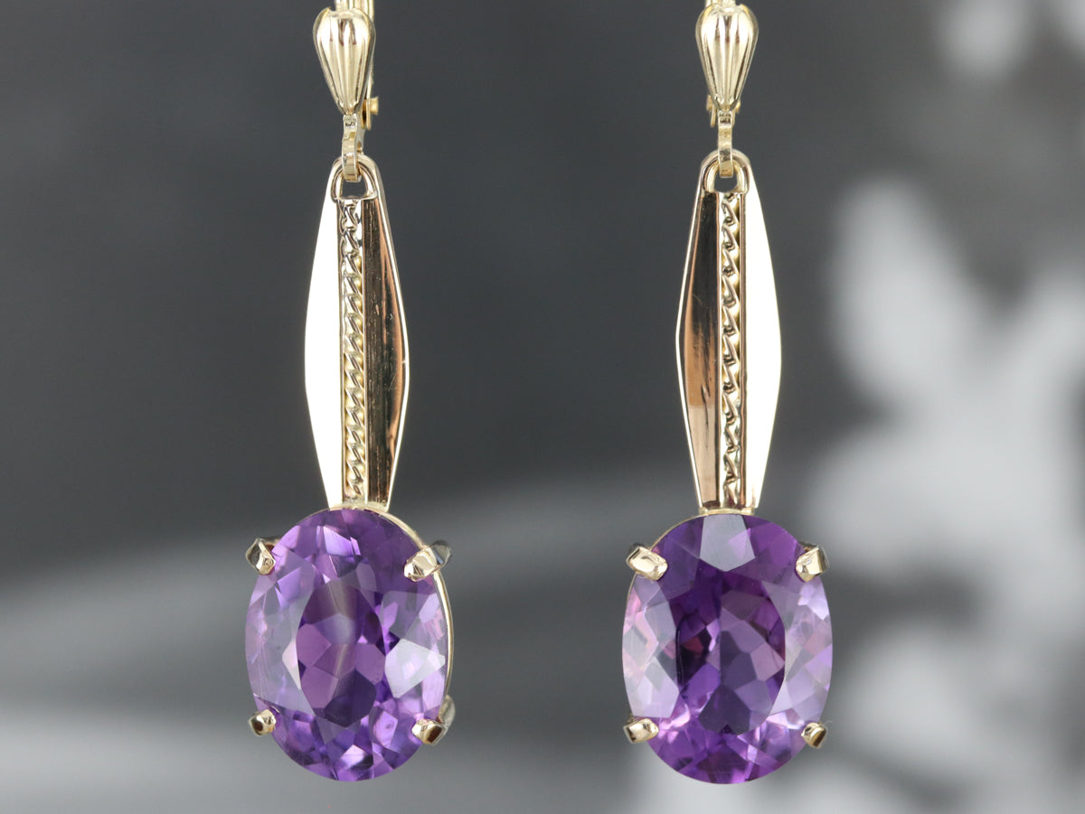 Here we've set deep, rich, purple amethyst in simple baskets of yellow gold. The open back allows light through the entire stone, accentuating the superb cutting of these rich, bright stones! The bar in the centers are sleek and polished originally links from a vintage watch chain. At the very top are the earring wires, hinged lever backs which are brand new, yellow gold with a simple polished design. These are comfortable to wear and very secure!