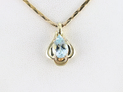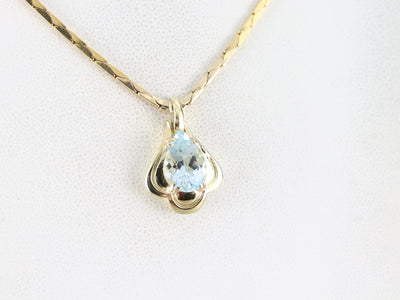 This gleaming yellow gold necklace has the look of an arrowhead in this sleek modern piece. We've set this with a new aquamarine, a bright centerpiece to this linear, eye-catching necklace!