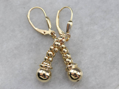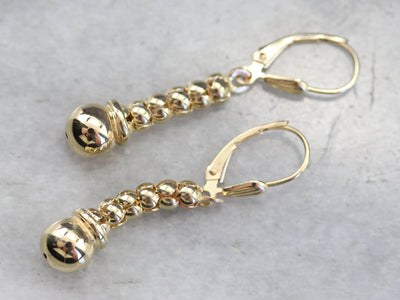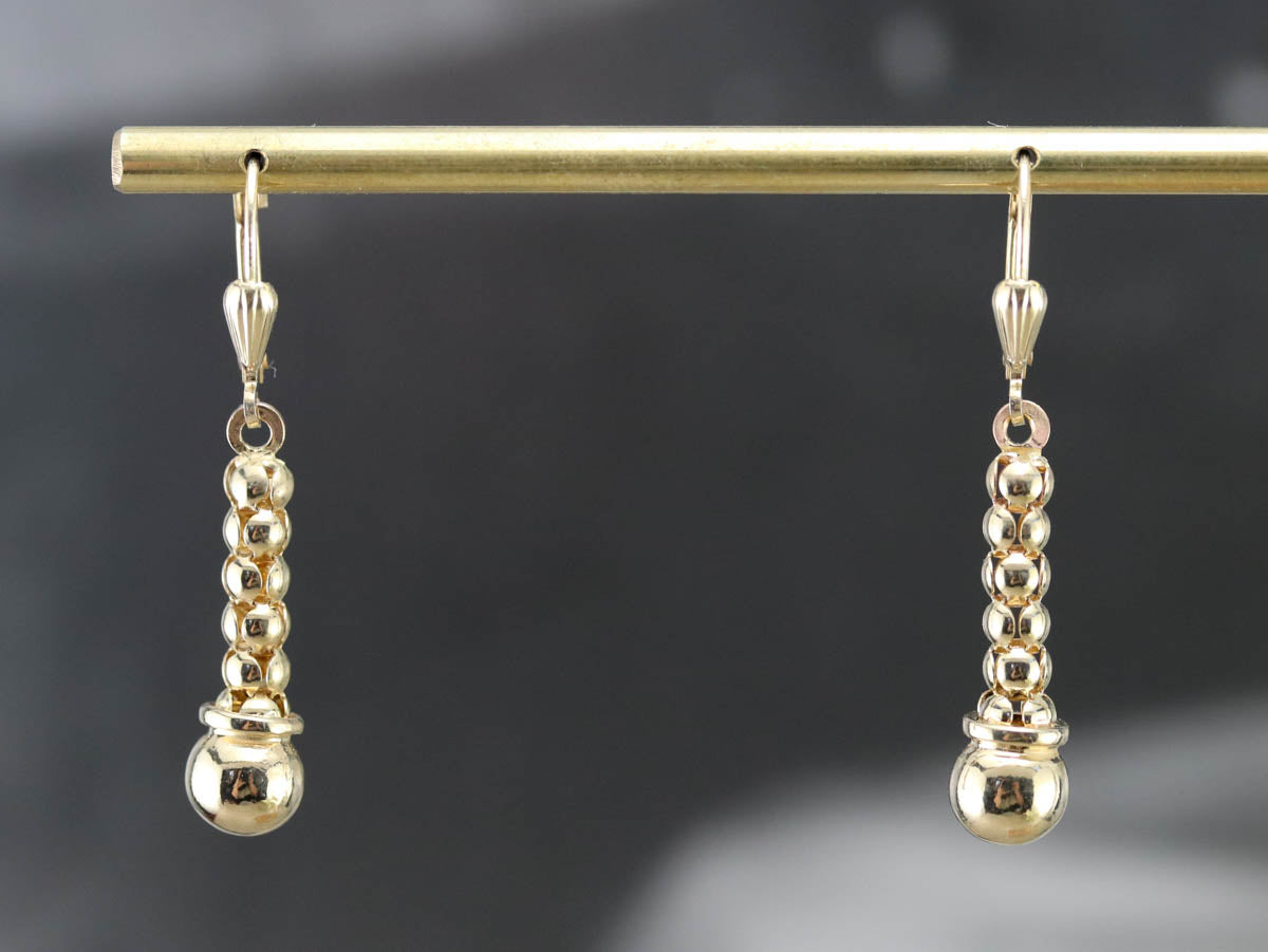 Sleek and shining come out to play in these vintage drop earrings crafted of 14 karat yellow gold. Hollow beads of gold swinging freely from simple lever back findings, perfect jewelry basics!