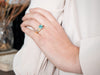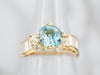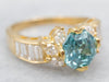 The combination of marquise and baguette cut diamonds is stunning! In the center sits a gorgeous blue zircon, sparkling with flashes of icy hues. The diamonds compliment the center stone beautifully, and the warm yellow 18-karat gold allows them to really shine!