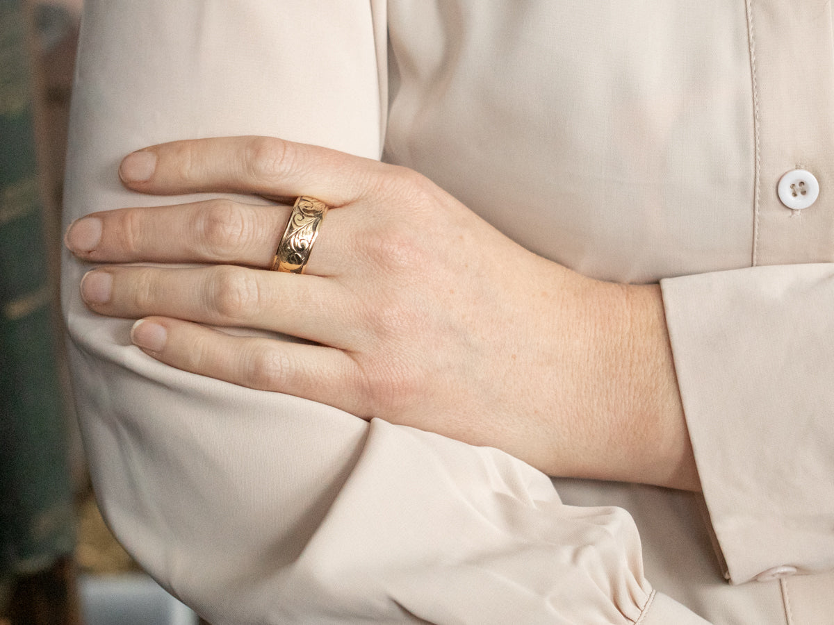 This stunning antique gold band is engraved with a beautiful floral pattern and is great for stacking and everyday wear!