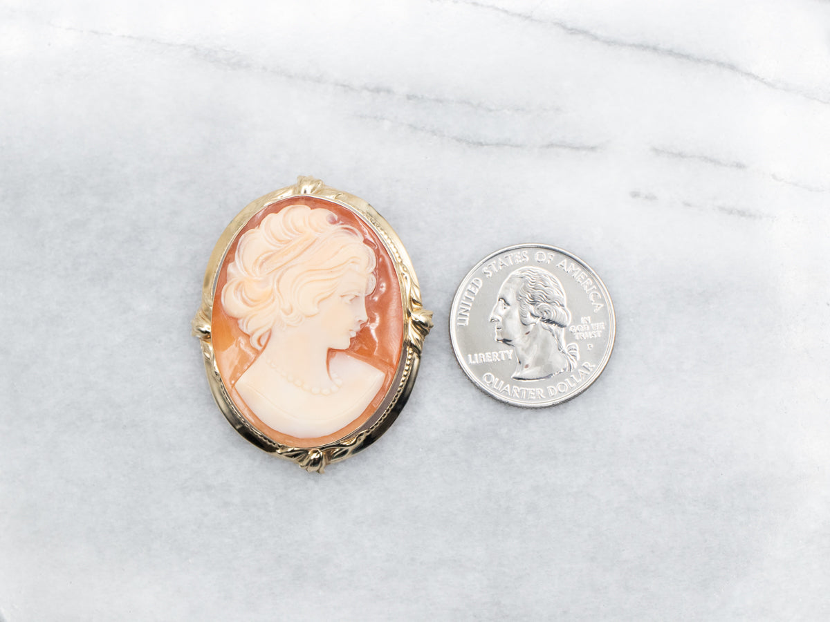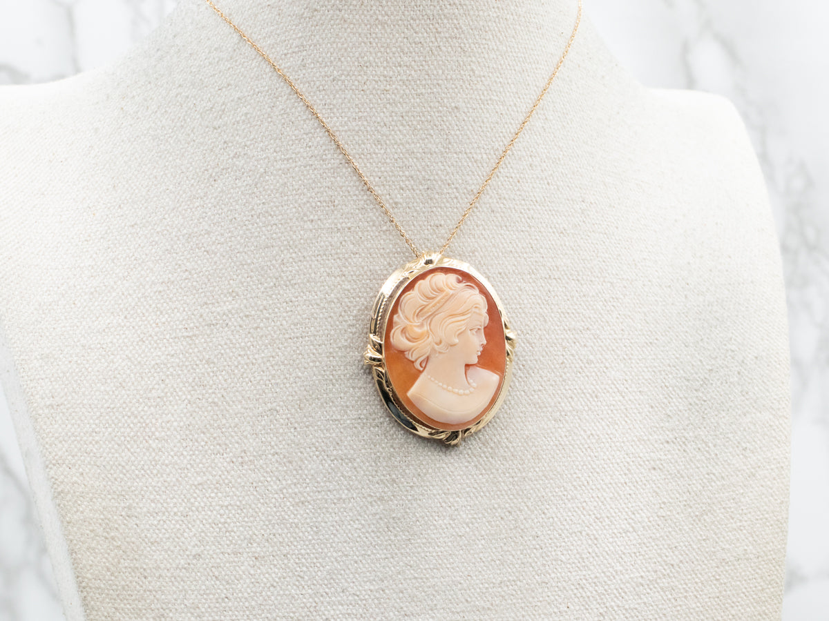 This lovely vintage cameo features some of the finest quality carvings we have seen! The curls in the lady's hair, and the string of pearls around her neck, are very nearly lifelike in their quality. Framed in polished yellow gold, this vintage piece can be worn as a pin or pendant!