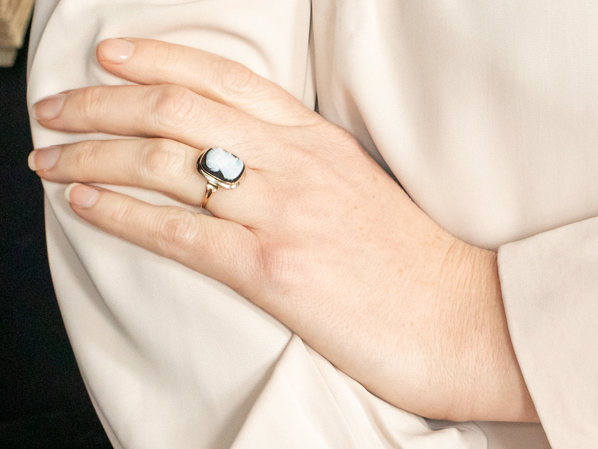 The vintage yellow gold band compliments the beautifully carved cushion cut sardonyx cameo, creating a beautiful piece that will add a touch of elegance to any outfit. Stand out with this solitaire ring!