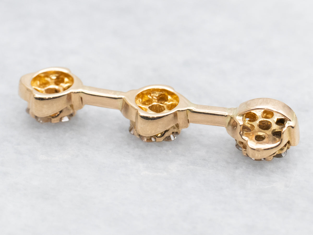 Shine bright with this playful pendant. Made with dazzling yellow gold and adorned with three sparkling diamond clusters, this pendant is sure to catch the eye. Perfect for adding a touch of fun and elegance to any outfit.