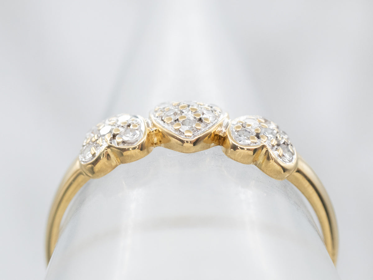 This romantic vintage band features diamond-encrusted hearts against a polished 18-karat gold mounting. Perfect for a sweetheart or promise ring!
