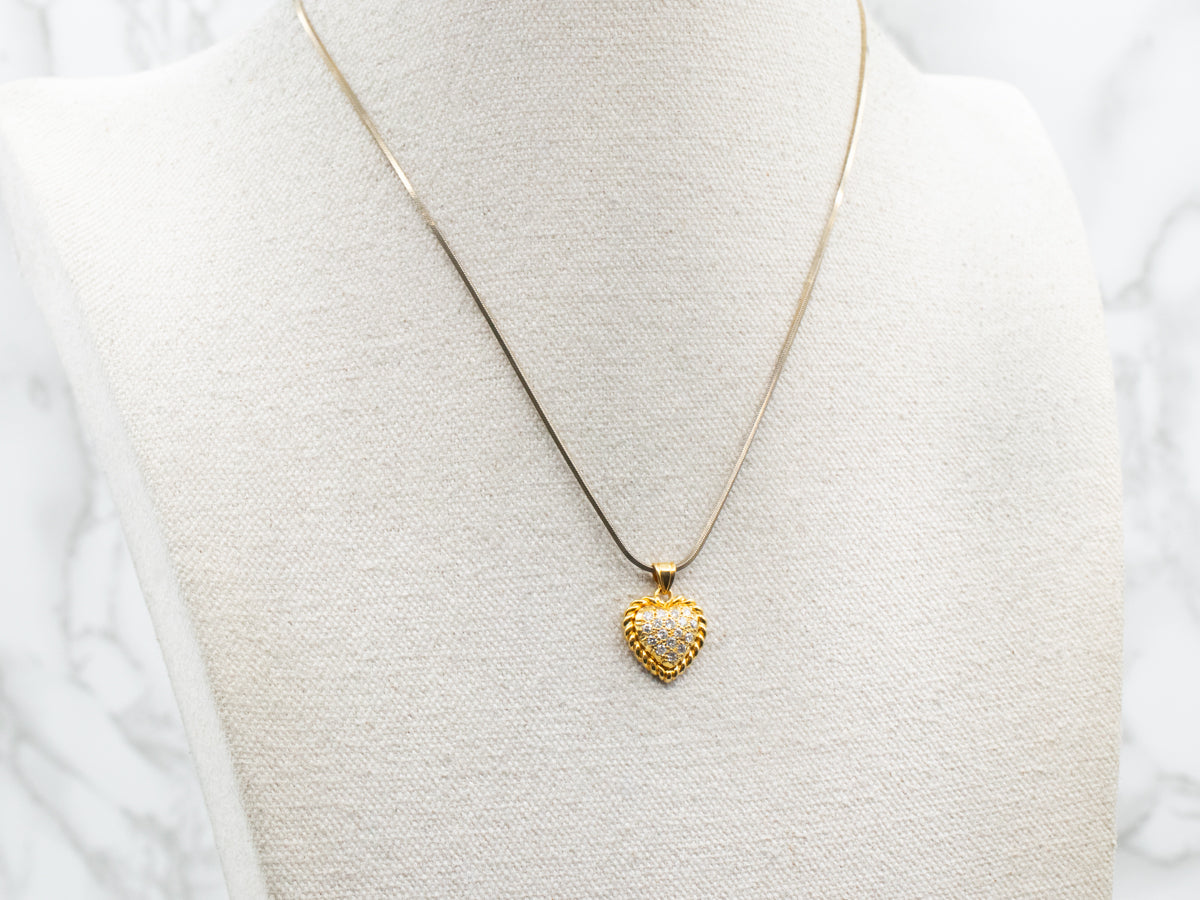 This dazzling heart shaped pendant is sure to steal hearts with its playful sparkle and sweet silhouette. Crafted from yellow gold and adorned with diamonds, this pendant is a charming addition to any jewelry collection. Perfect for adding a touch of whimsy to any outfit.