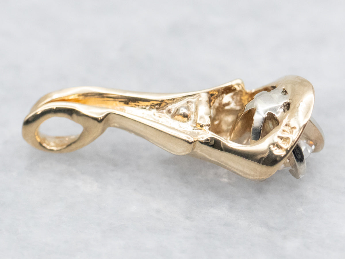 This playful piece features a stunning diamond solitaire set in a delicate botanical design. Perfect for any occasion, this unique pendant is sure to stand out and make a statement!