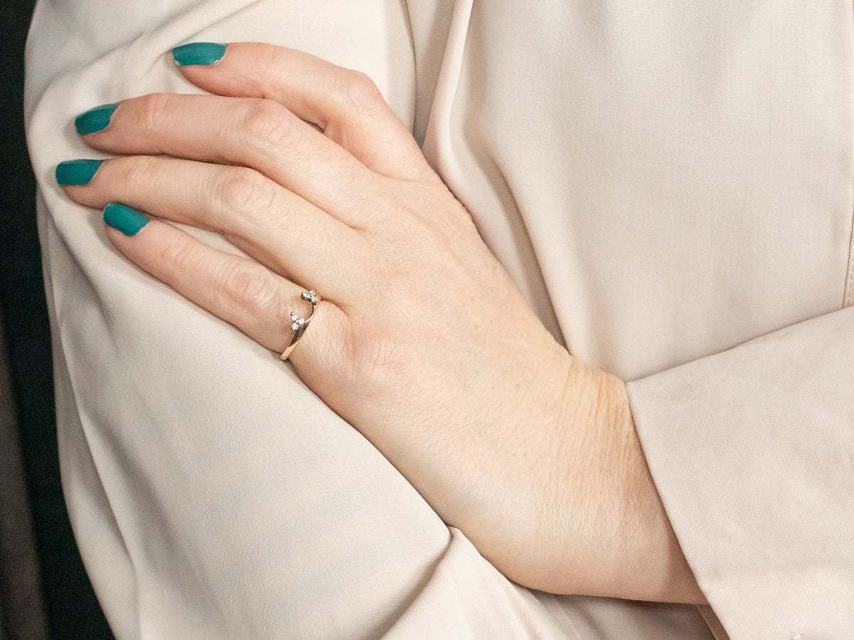 Metal: 14K Yellow Gold Gem: 6 Diamonds totaling .12 Carats, I in Clarity, H-J in Color Width of Band: 5.2 mm Height off Finger: 4.8 mm Gap Measurement: 5.6 mm Ring Size: 5 Marks: "S&S 14K" Stamped on the inside band