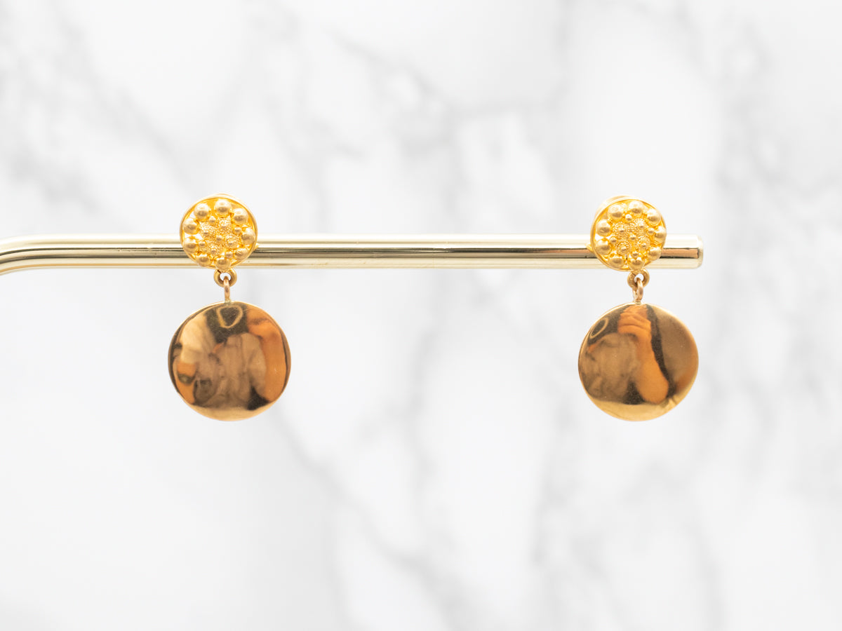 Adorn yourself with these classic yet stunning earrings. Crafted from glamorous Portuguese yellow gold, these earrings feature a classic disc design and gentle drop that will flatter all. A perfect accessory for any occasion.