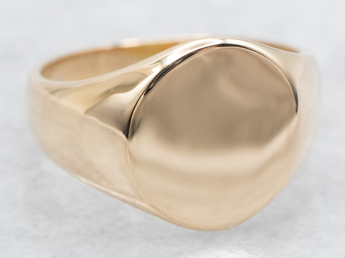 Get ready to make a statement with this signet ring! Crafted with vibrant yellow gold, this unique ring features an oval top that can be personalized with your own engraving. Perfect for adding a touch of individuality to any outfit.