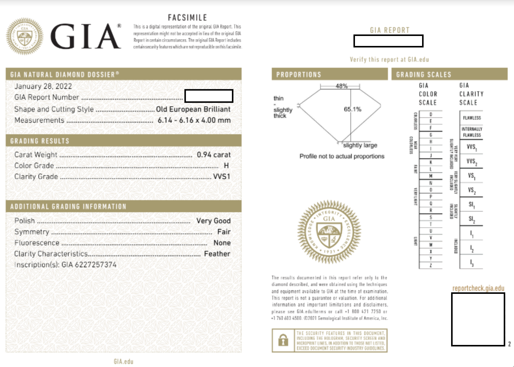 Metal: 14K Yellow Gold Gem: European Cut Diamond .94 Carats, VVS1 in Clarity, H in Color Gem Measurements: 6.1 mm, Round Ring Size: 4.25 Marks: "14K" Stamped on the inside band GIA Report Number: 622*********