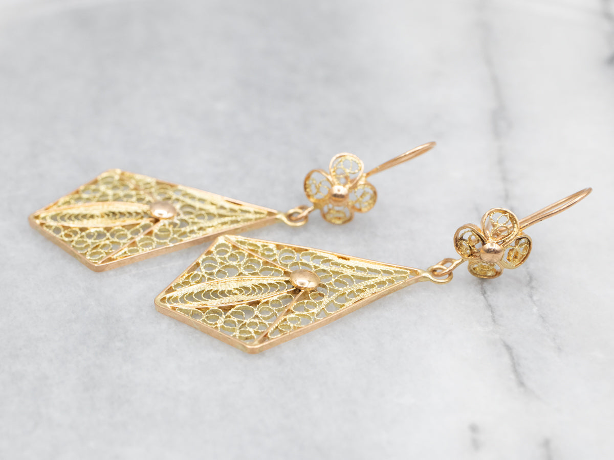 These vintage yellow 18-karat gold floral filigree drop earrings catch the light in an excellent way! These are moderately sized in look but lightweight and easy to wear. The hinged bar snaps closed securely.