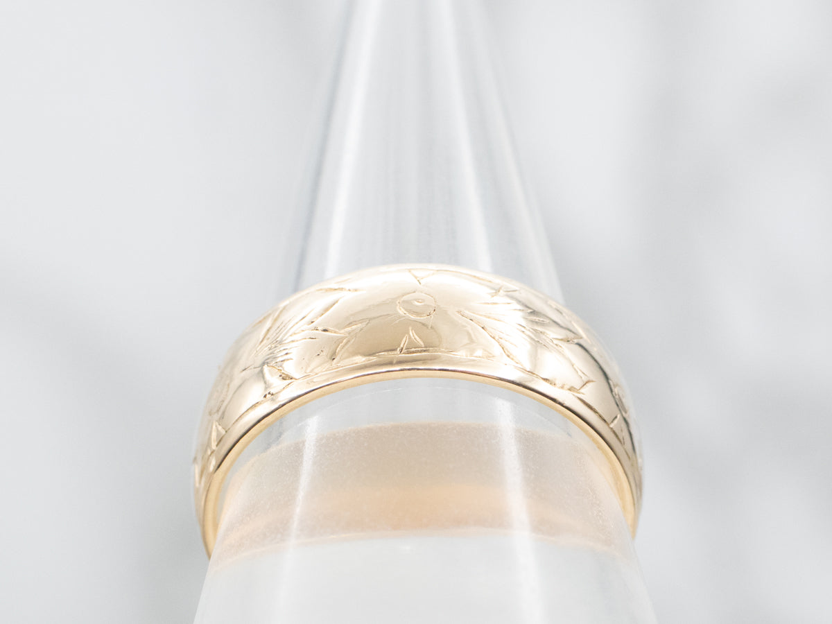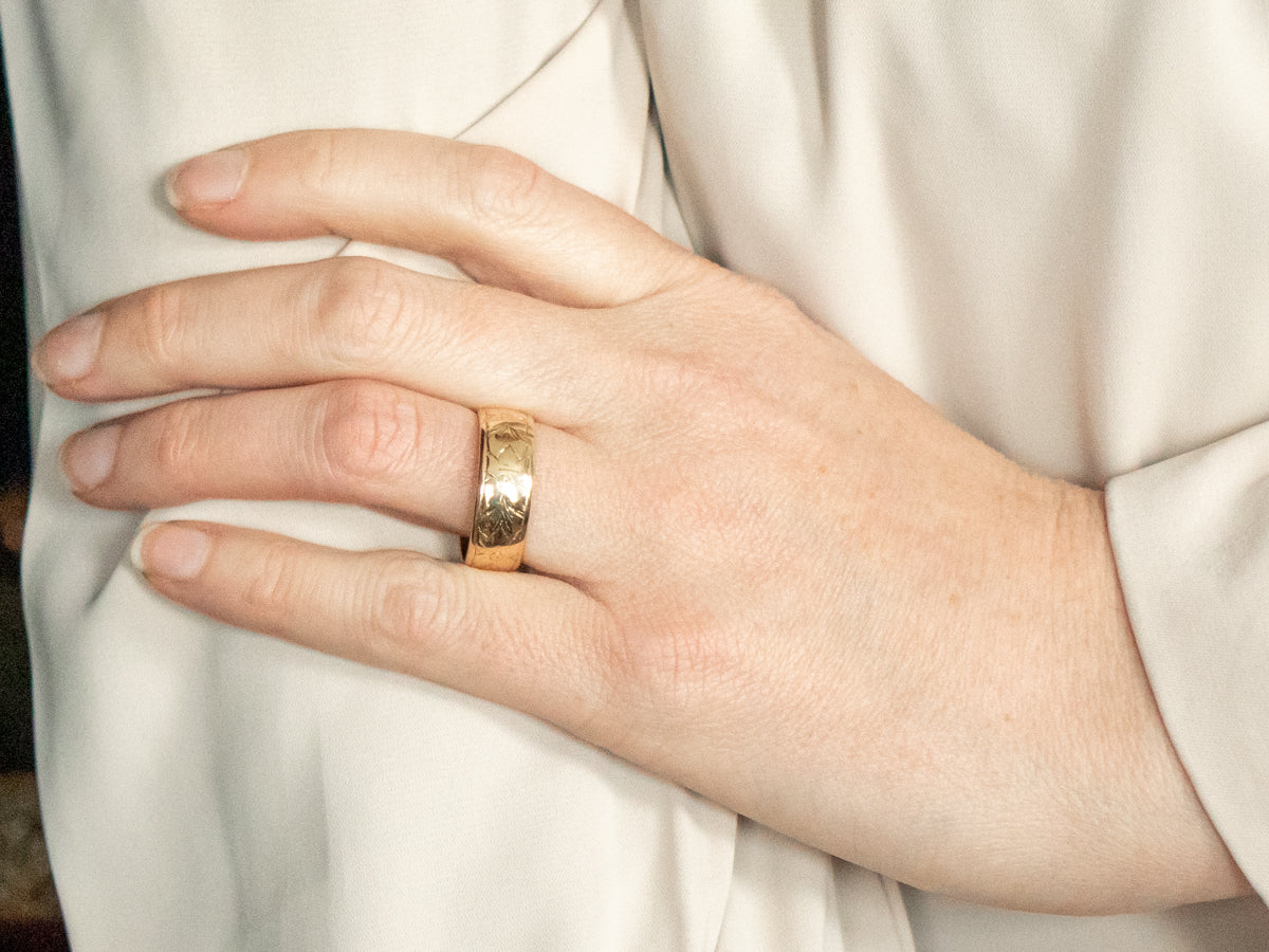 Crafted in yellow gold, this cigar band features stunning floral etchings. Elevate your accessory collection with this elegant and unique piece, perfect for any occasion. Add a touch of sophistication to your look with this must-have band!