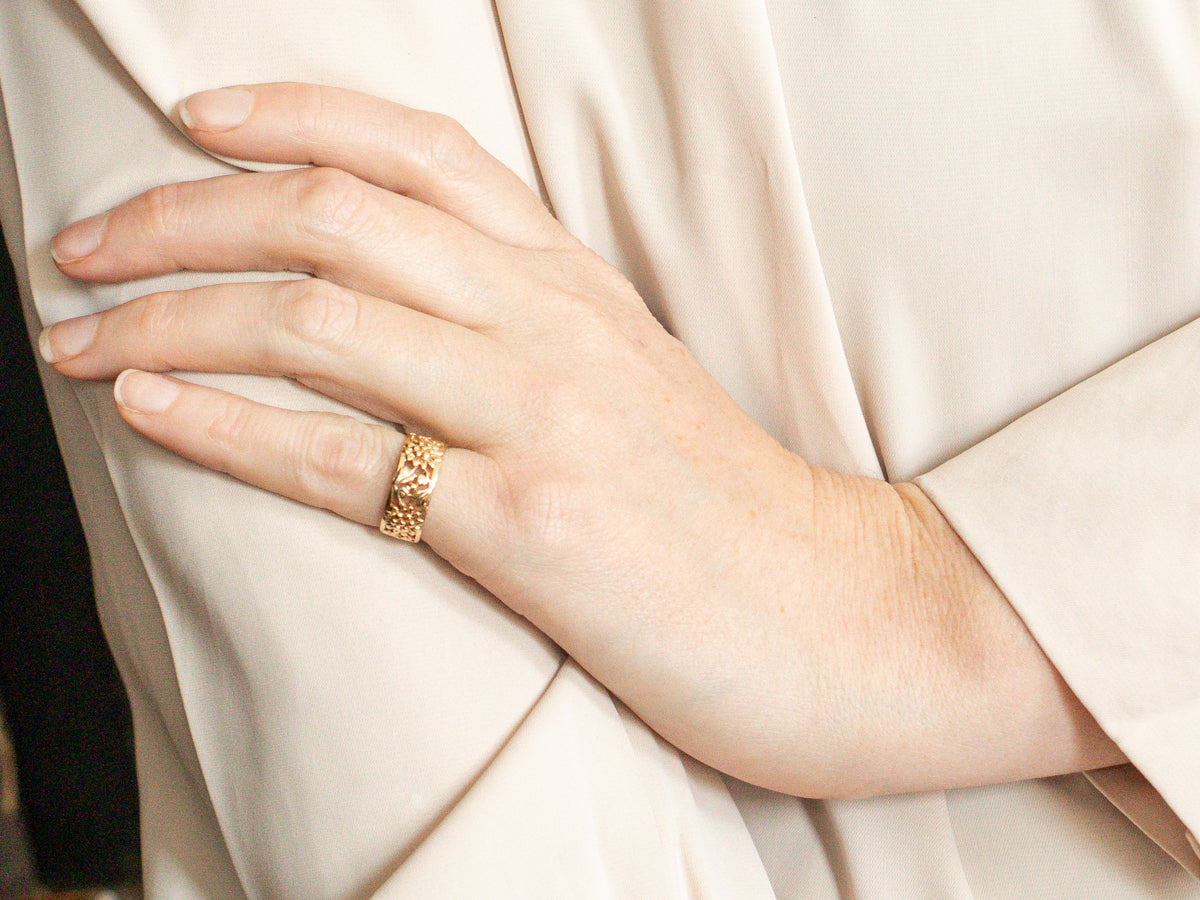 Crafted with stunning detail, this band features intricate floral designs in elegant yellow gold. Let this band be a timeless addition to your collection, adding a touch of sophistication and beauty to any look.