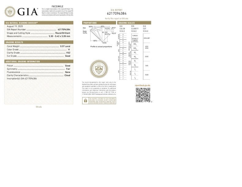 Metal: 18K Yellow Gold Gem: GIA Certified Diamond .57 Carats, VS2 in Clarity, H in Color Gem Measurements: 5.3 mm, Round Accents: 28 Diamonds totaling .18 Carats, SI in Clarity, G in Color Ring Size: 6.75 Marks: "18K DO21" Stamped on the inside band GIA Report Number: 621*********