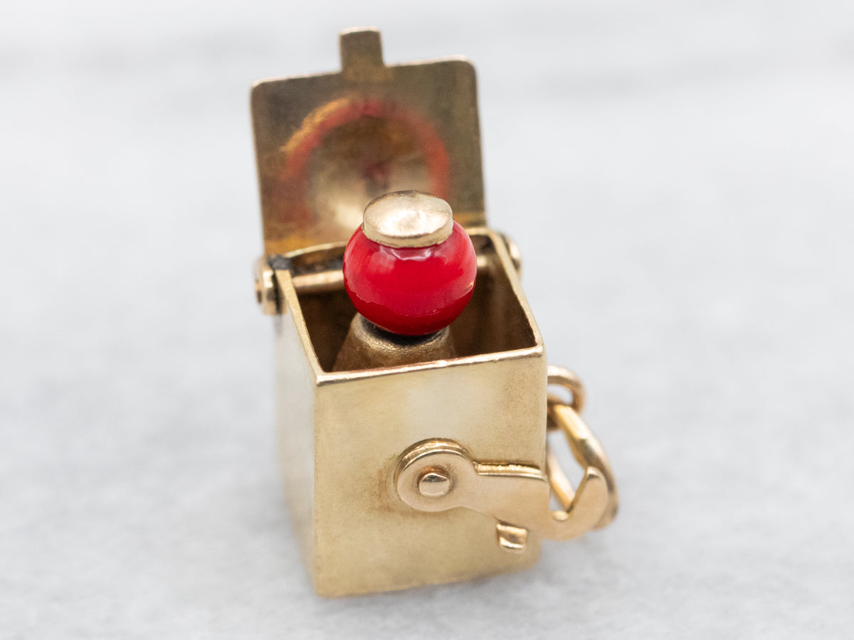 This charm features a playful jack in the box design, adding a touch of whimsy to any jewelry collection. Made with yellow gold, this charm is a versatile addition to any accessory, offering a polished and stylish look. Perfect for anyone who loves unique and fun jewelry pieces!
