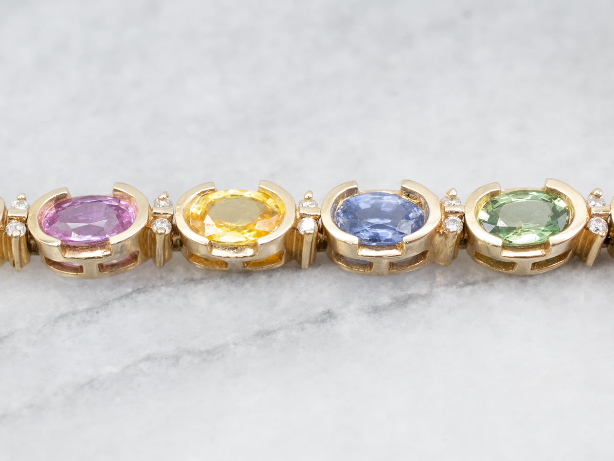 Metal: 14K Yellow Gold Gem: Multi-Colored Sapphires Gem Measurements: 6.7 x 4.1 mm, Oval Accents: Diamonds totaling .37 Carats, SI2 in Clarity, I in Color Width: 5.5 mm Length: 7 Inches Marks: "14K <> 1763" Stamped on the clasp