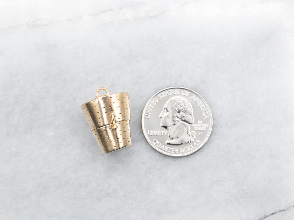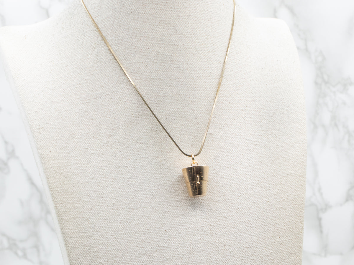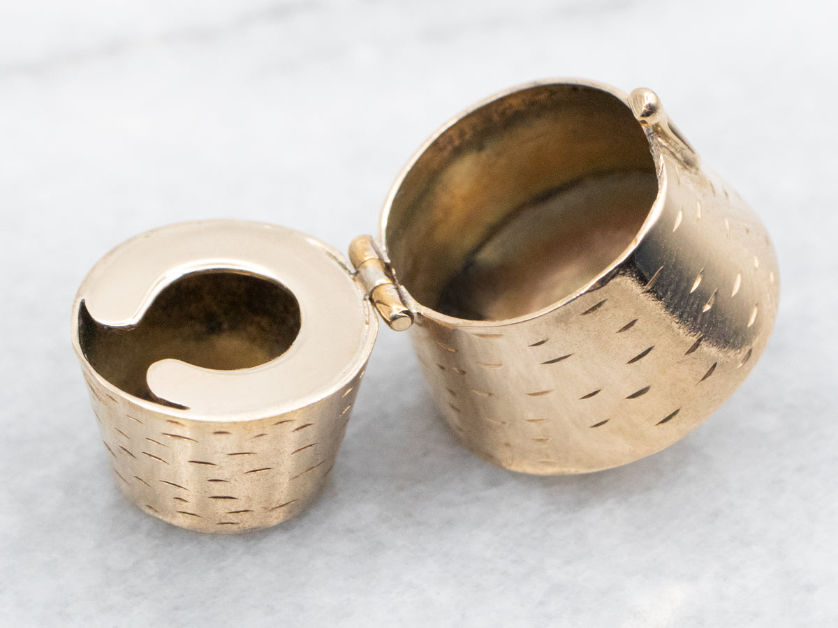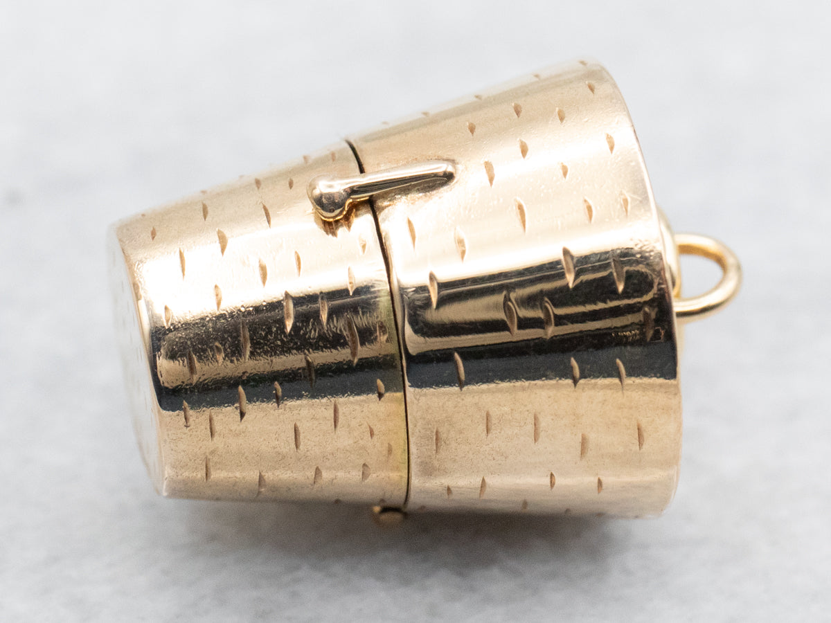 Crafted from textured yellow gold, this pendant features a unique opening container design, adding a touch of exclusivity to your style. Make a statement with this quirky piece, sure to elevate any outfit.