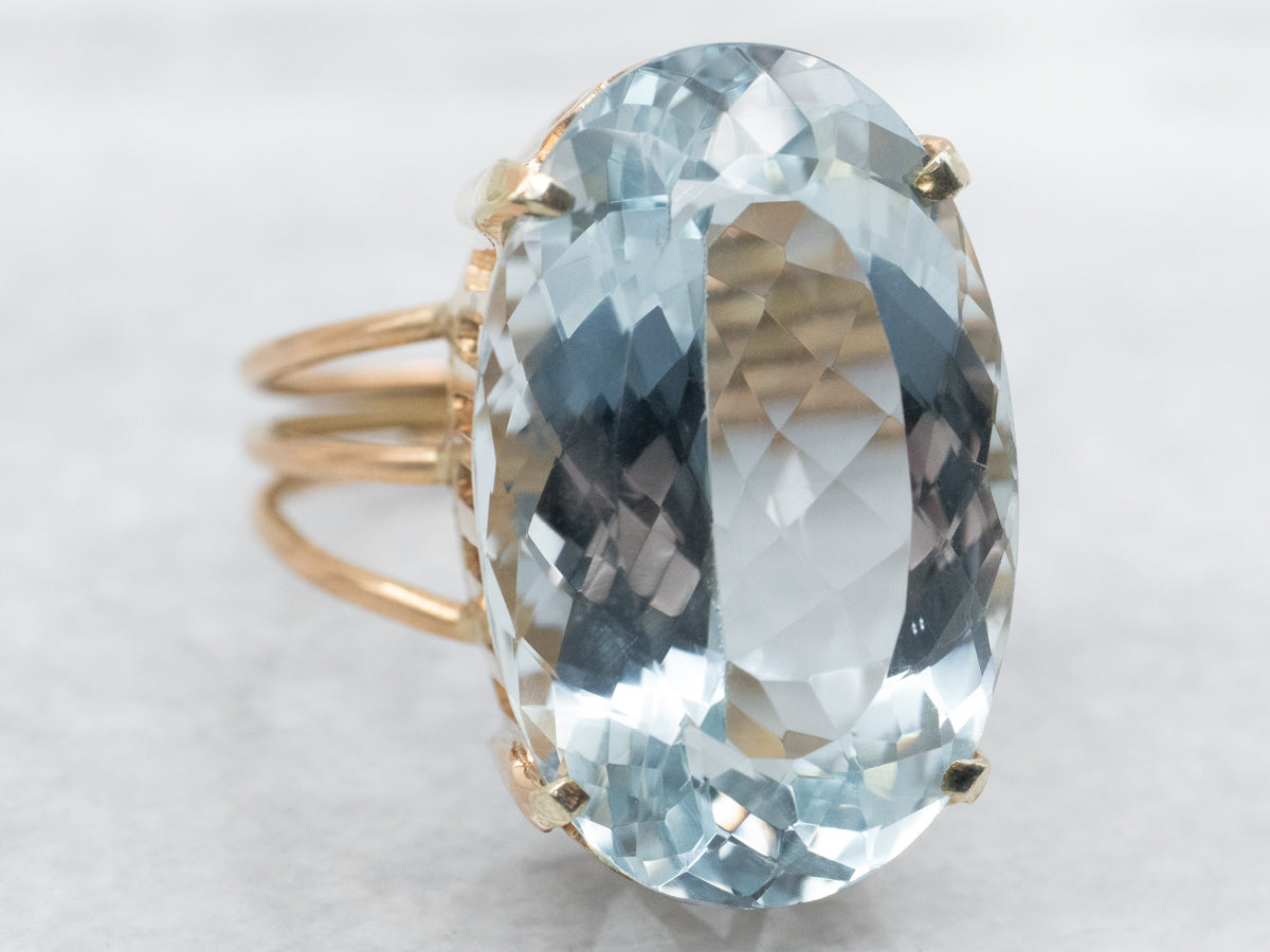 This vintage yellow gold mounting is perfect, using four simple prongs to create structure and visual interest. We've set this piece with a modern, large oval blue topaz. The color of this stone is bright, a rich cyan, almost turquoise color. This would make a lovely cocktail ring, and is also a sturdy enough stone to wear daily!