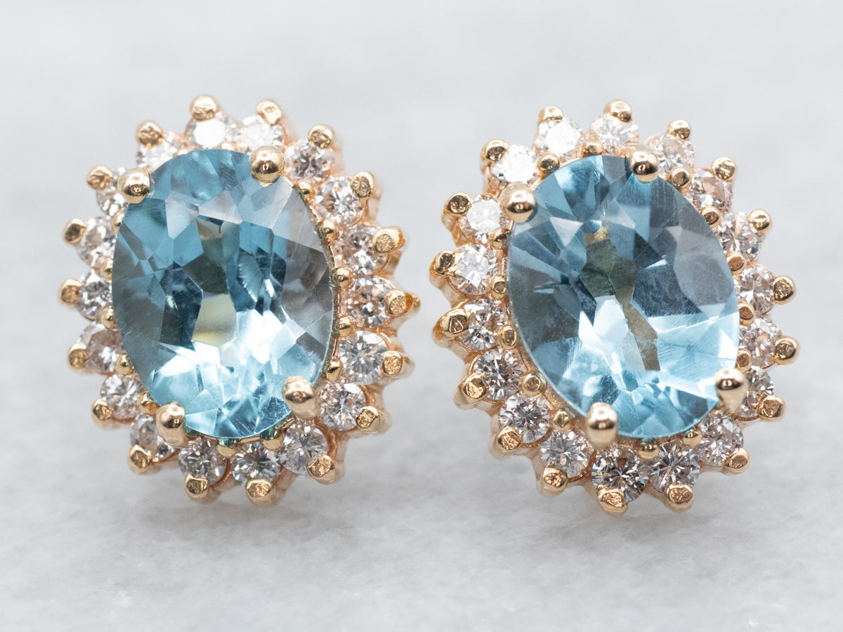 Add a pop of color to any outfit with these pretty yellow gold oval cut blue topaz stud earrings. The diamond halo adds a touch of glamour and sparkle to these playful and unique earrings. Perfect for those who don't take themselves too seriously, these earrings are a must-have accessory!