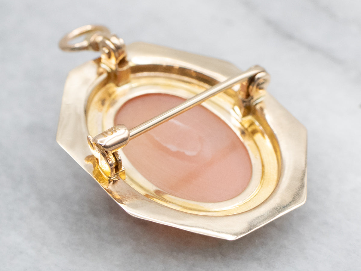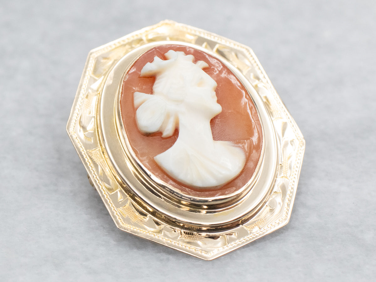 This vintage shell cameo is crafted in wonderful tones of white and apricot with accents of creamy ivory! Yellow gold comprises the frame, while the cameo at the center is carved from a lovely conch shell. Cameo is the art of carving a layered material, creating a portrait or landscape in the differing colors and textures. Shell is the traditional medium for this artwork.