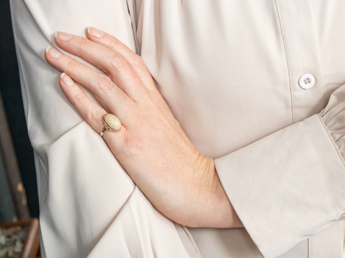 Metal: 10K Antique Rose Gold Gem: Opal 5.53 Carats Gem Measurements: 9.7 x 15.5 mm, Oval Ring Size: 3.75 Marks: "10K" Stamped on the inside band
