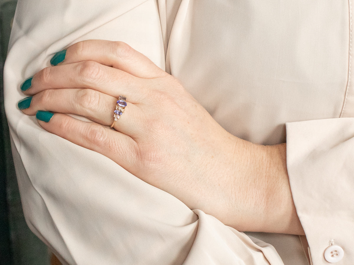 Add a pop of color to any outfit with this playful yellow gold ring featuring stunning oval cut tanzanite stones and sparkling diamond accents. Elevate your style game with this unexpected and unique piece.