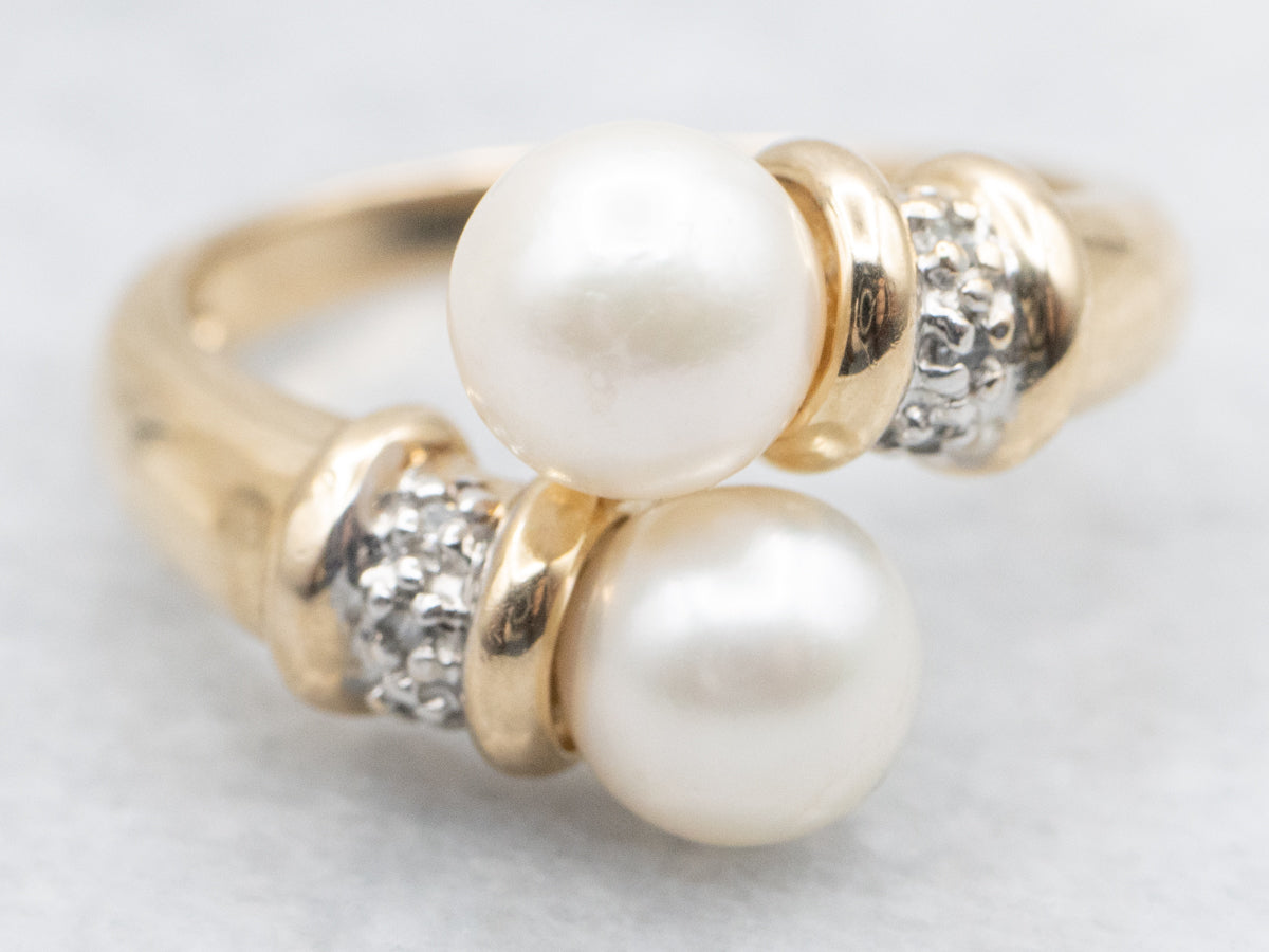 Polished 14-karat gold stretches these pretty white cultured pearls apart, creating a little space between them and a wider profile across the finger. High-quality diamonds bring some sparkle to this stunning bypass piece!