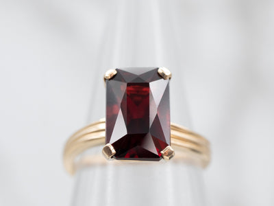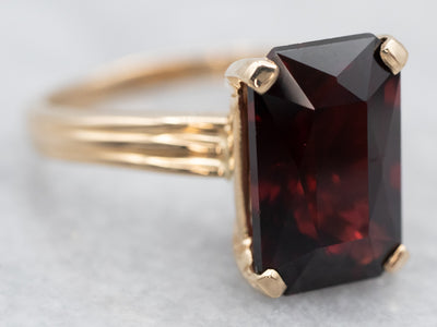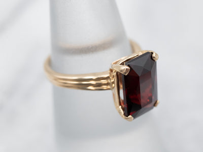Metal: 14K Yellow Gold Gem: Garnet 4.60 Carats Gem Measurements: 7.1 x 11.1 mm, Emerald Cut Ring Size: 5.25 Marks: “14KP 585” Stamped on the inside band
