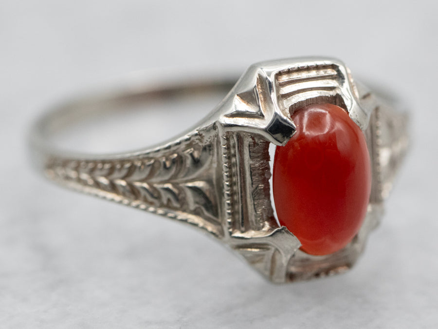 This ring features a simple and classically designed mounting, the structural openwork shoulders lend a sense of light and grace to the mounting. Cut into a classic elongated emerald cut, the deep red cherry garnet in the center adds a lovely pop of color and also an interesting shape to a simple ring!