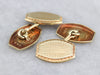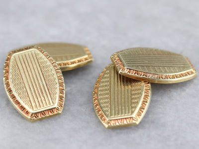 These early retro era cufflinks are the very definition of sophistication. The metal is bright, highly polished yellow gold, worked in a geometric pattern. Handsome and traditional ready to wear or gift!