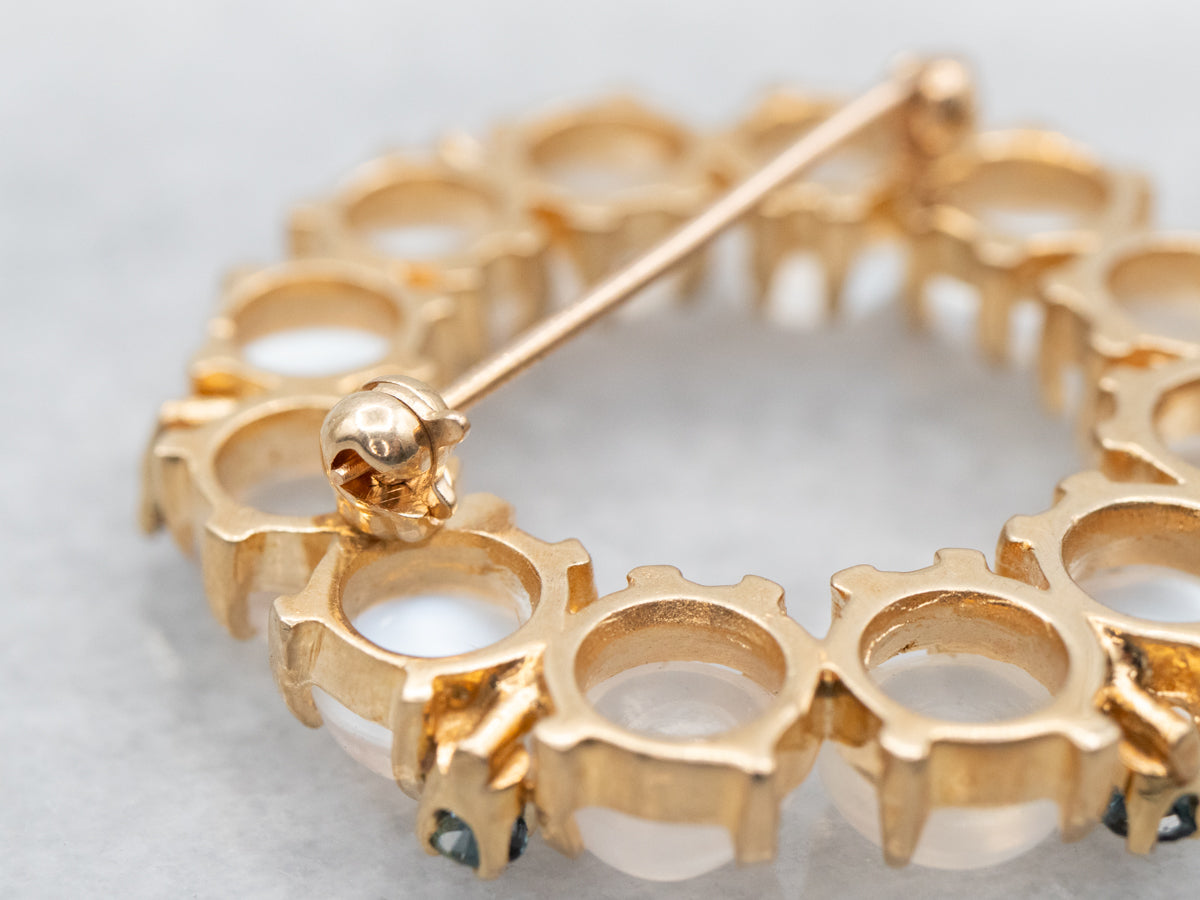 A classic circle pin, also called a wreath brooch, in bright yellow gold. The sapphires in this vintage piece are clean, deep blue with plenty of light and life. Etherial moonstones make a bright counterpoint to the richly-hued sapphires!