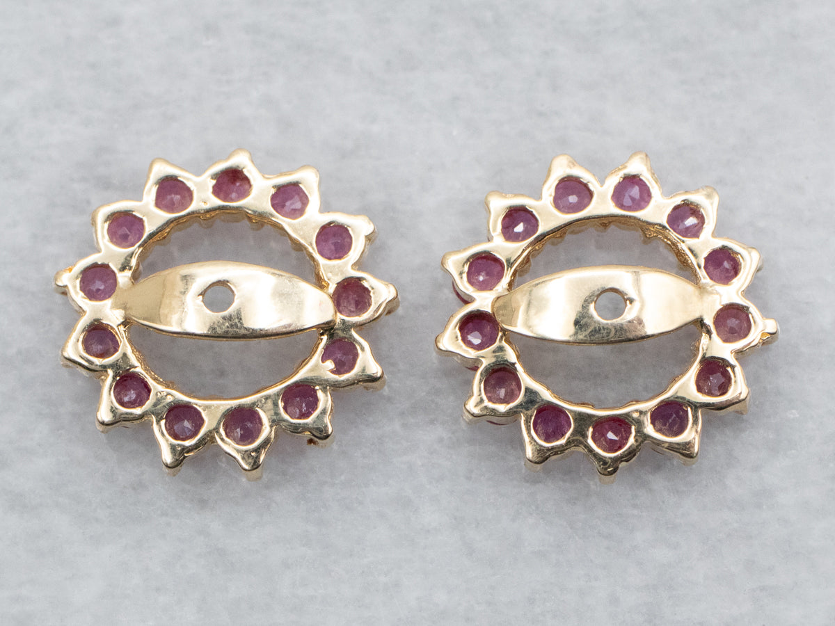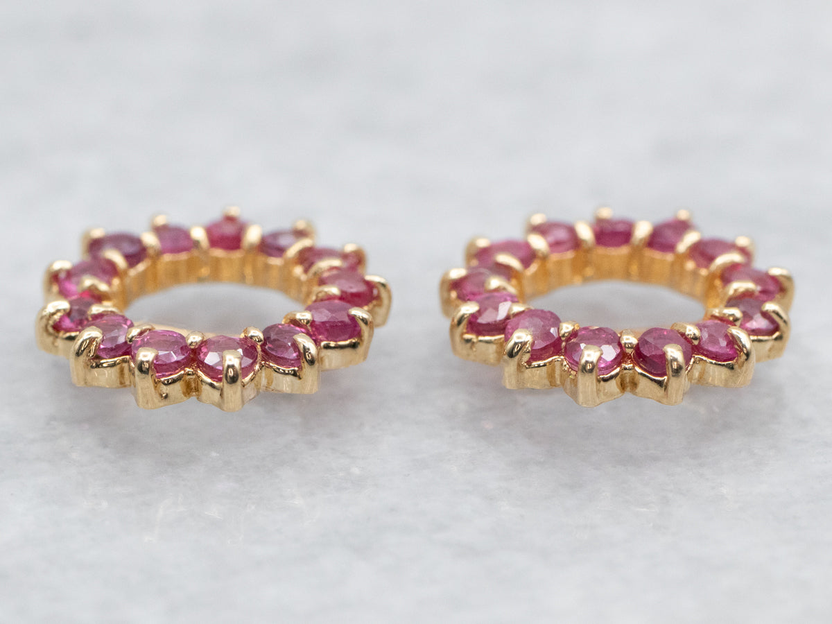 Metal: 14K Yellow Gold Gem: 24 Rubies totaling .42 Carats Gem Measurements: 1.9 mm, Round Measurements: 11 mm, Round Fits with Stud Size: 6.0 mm, Round