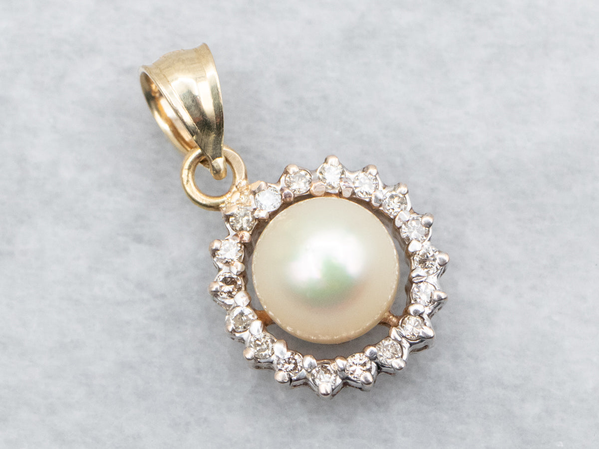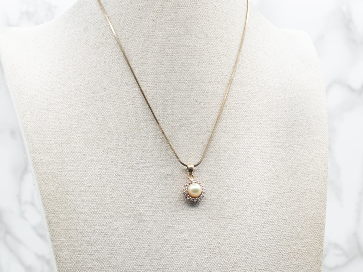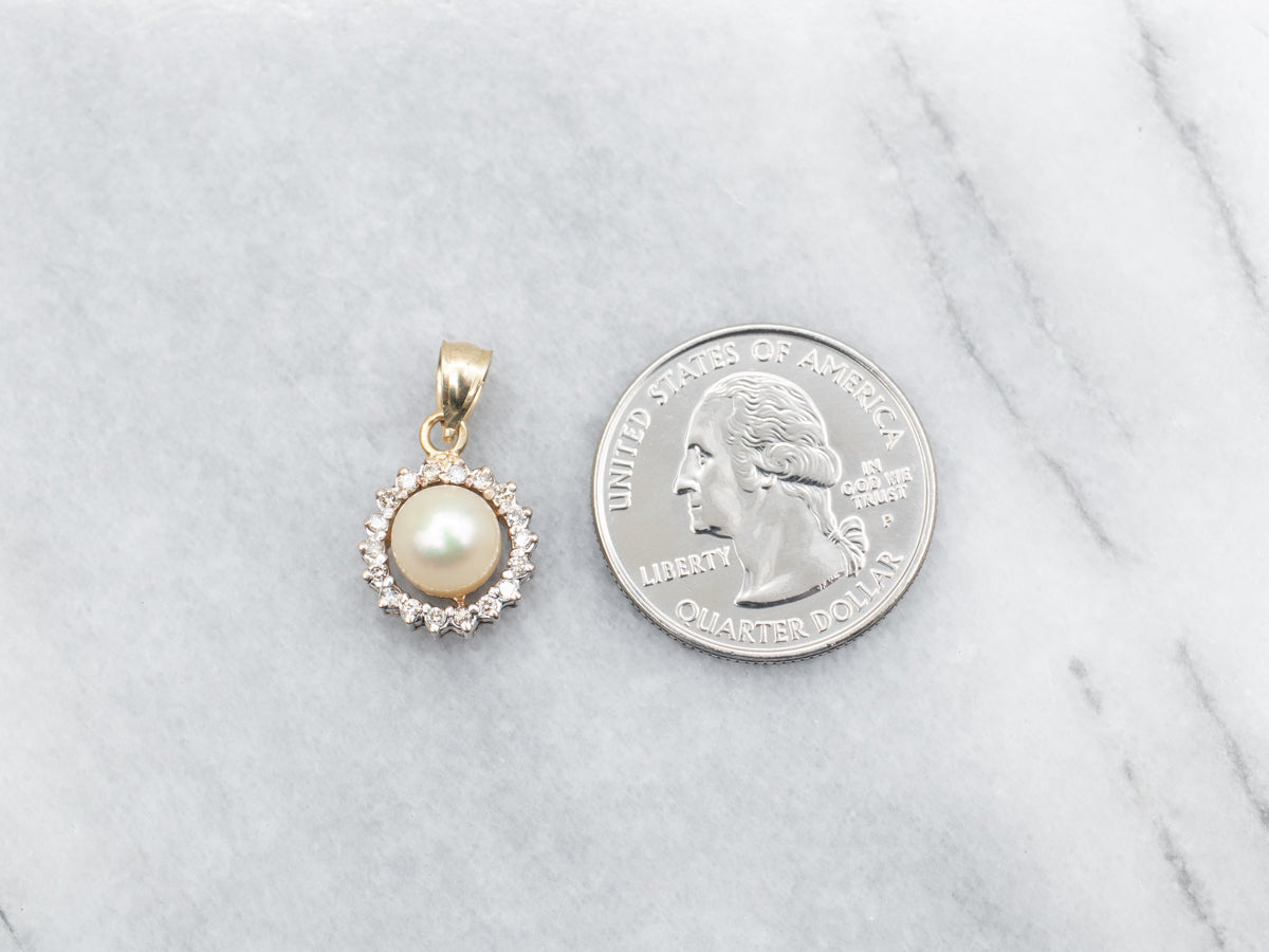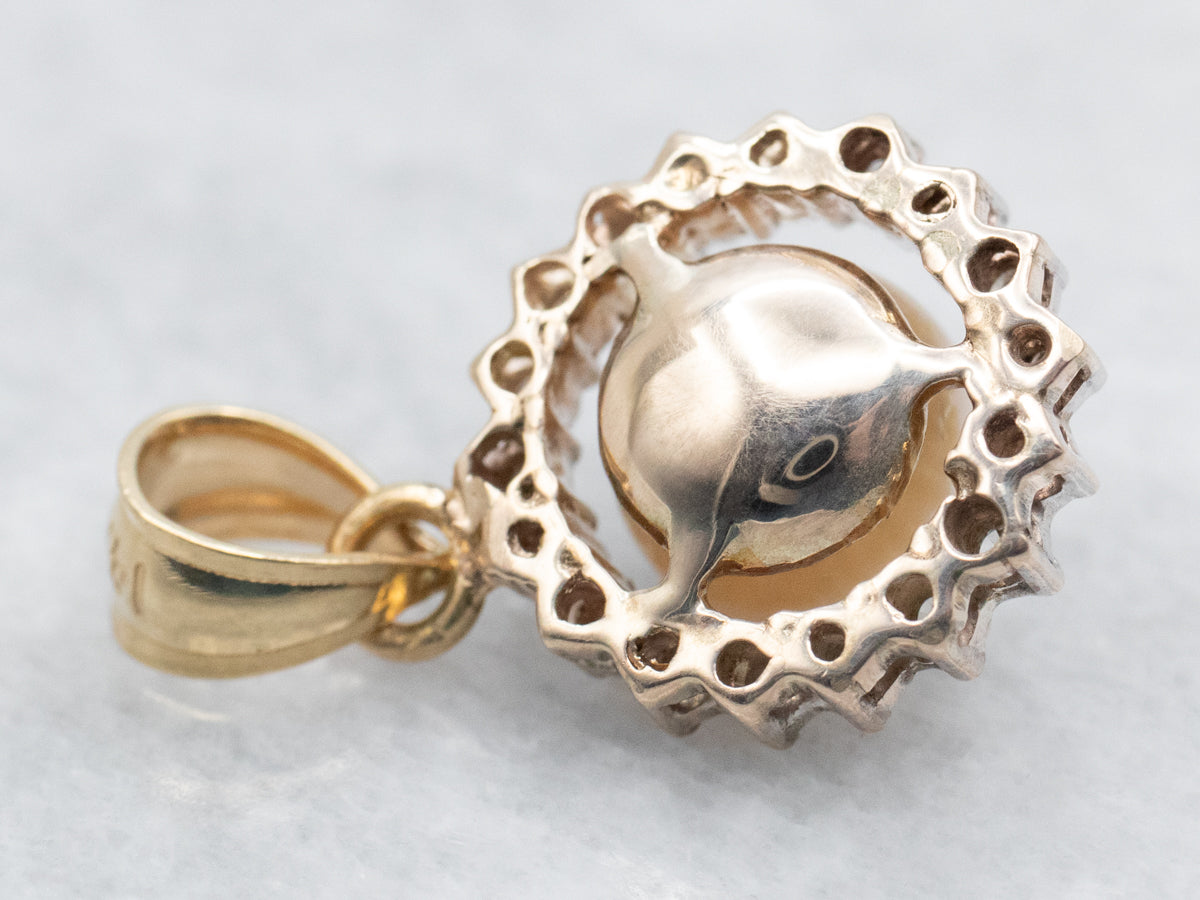 Add a touch of opulence to any outfit with this playful pendant. The lustrous yellow gold and gleaming saltwater pearl exude elegance, while the sparkling diamond halo adds a touch of whimsy. Perfect for any occasion, this pendant is sure to make a statement!
