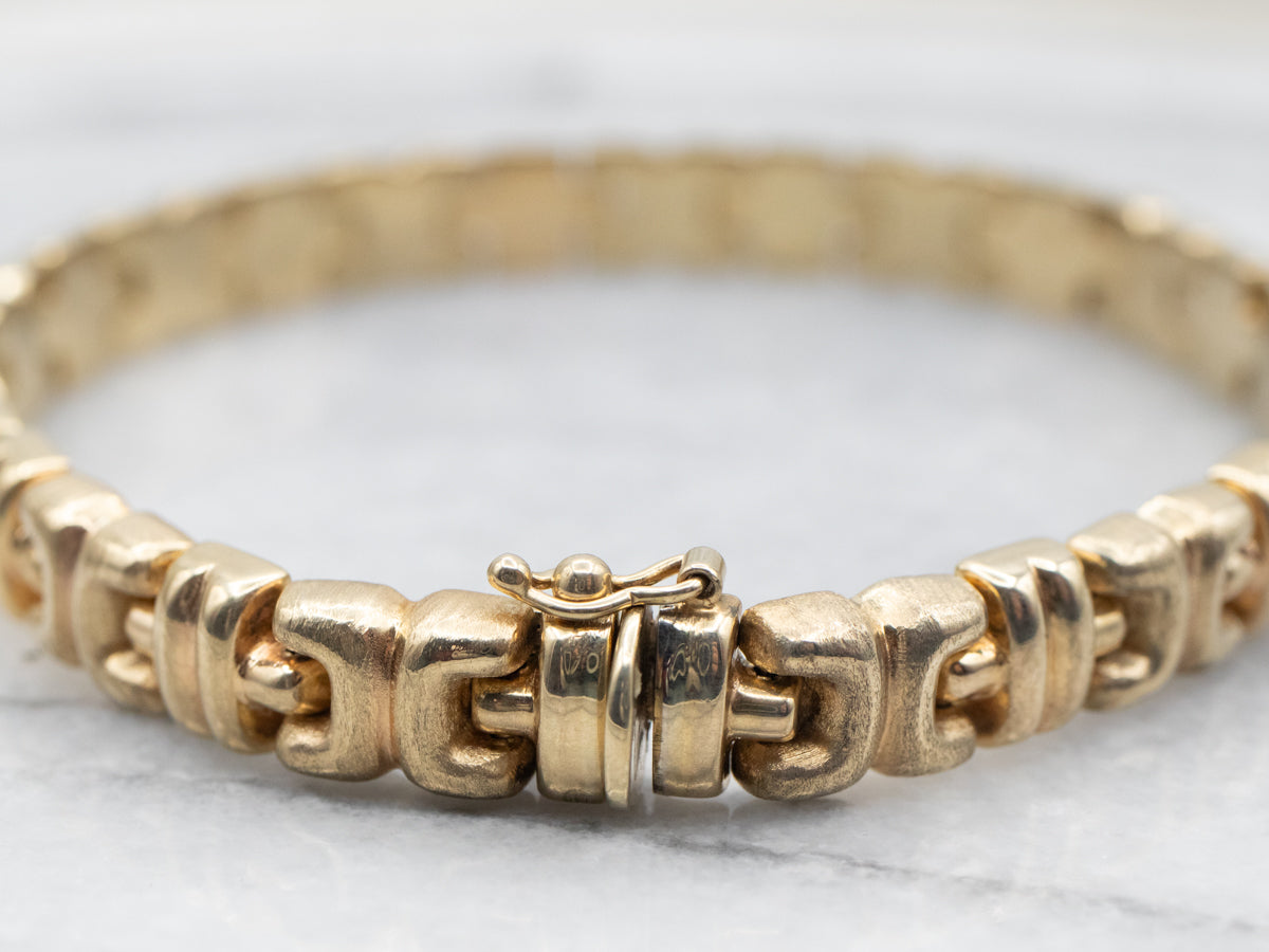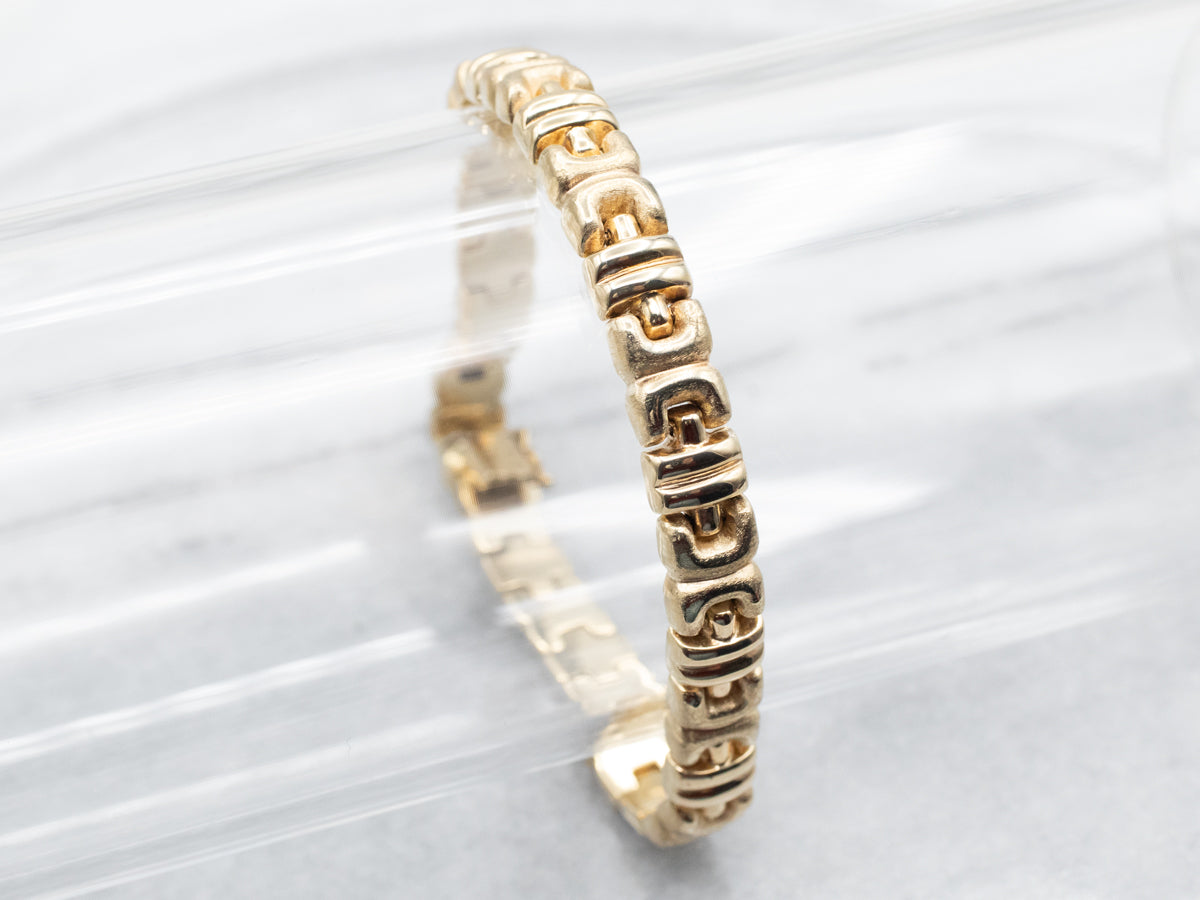 This dazzling yellow gold X link bracelet is sure to be a conversation starter! Make an impact with this sparkling piece that's perfect for any occasion. Show off your unique style and turn heads with this gorgeous bracelet!