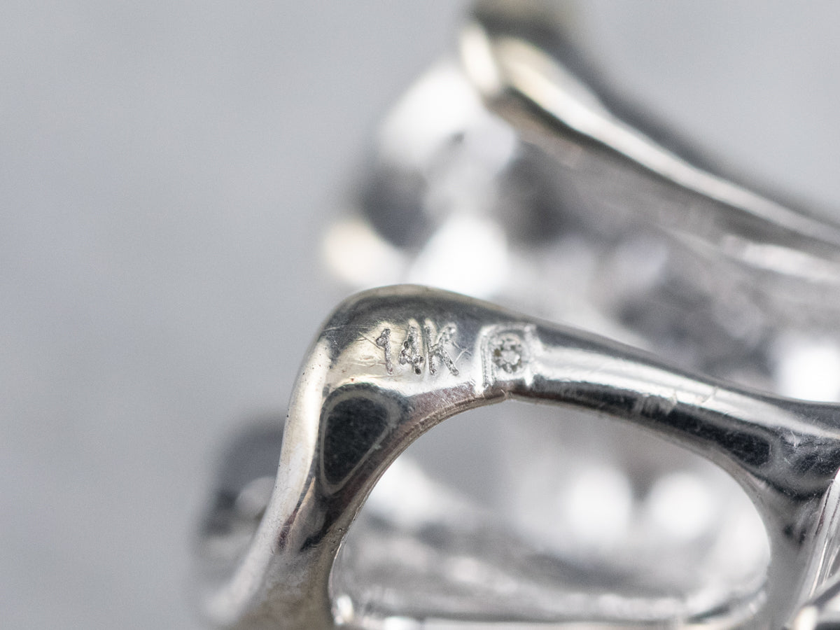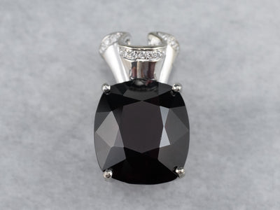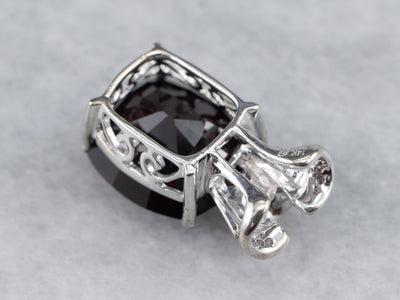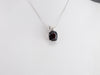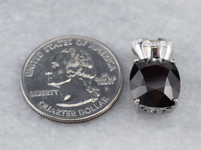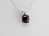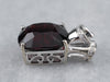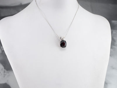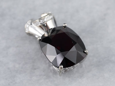 Metal: 14K White Gold Gem: Garnet 8.80 Carats Gem Measurements: 12.6 x 11.1 mm, Cushion Cut Accents: 15 Diamonds totaling .08 Carats, SI1 in Clarity, G in Color Measurements: 20 x 11 mm, with bail Marks: "14K" Stamped on the reverse